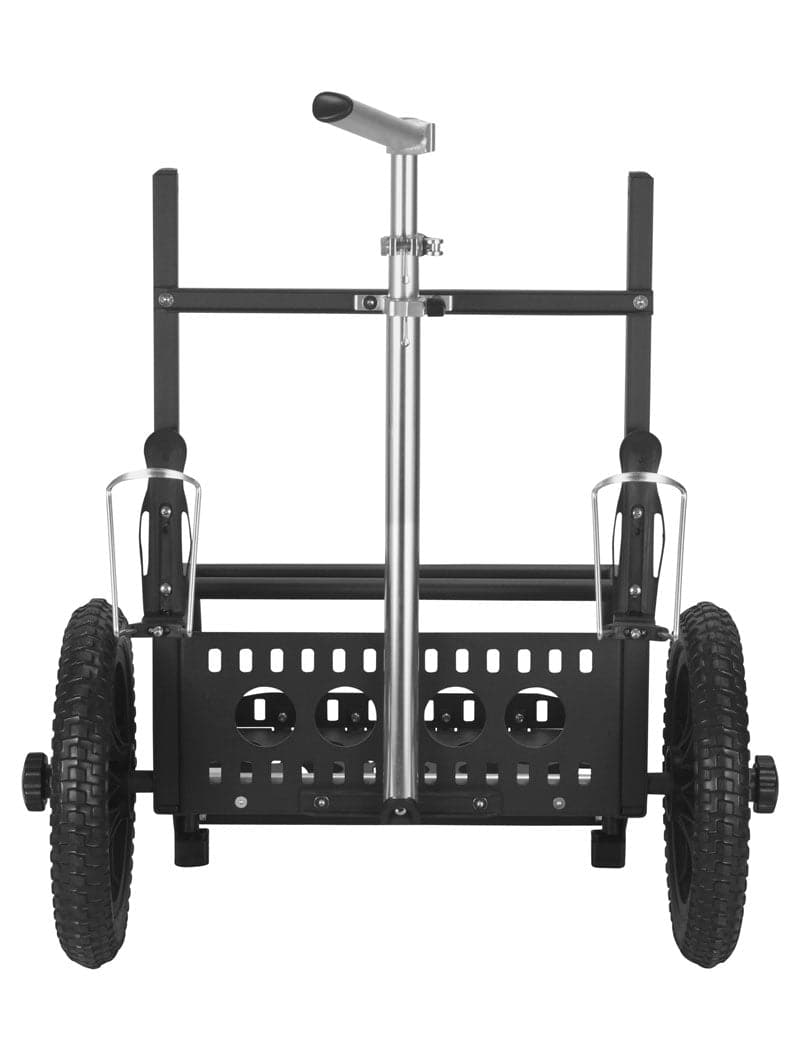 Our open-frame design provides expanded capacity to accommodate even the largest disc golf backpacks. The built-in bag support shelf improves accessibility to all your equipment and creates a separate storage area that provides flexibility to carry a variety of bags and equipment. Turn your favorite bag into a rolling backpack and go anywhere with less effort and stress. Travel with heavy gear on any terrain - from urban to suburban. Holds most disc golf bags with ease - even oversized models. This cart is NOT made to sit on.