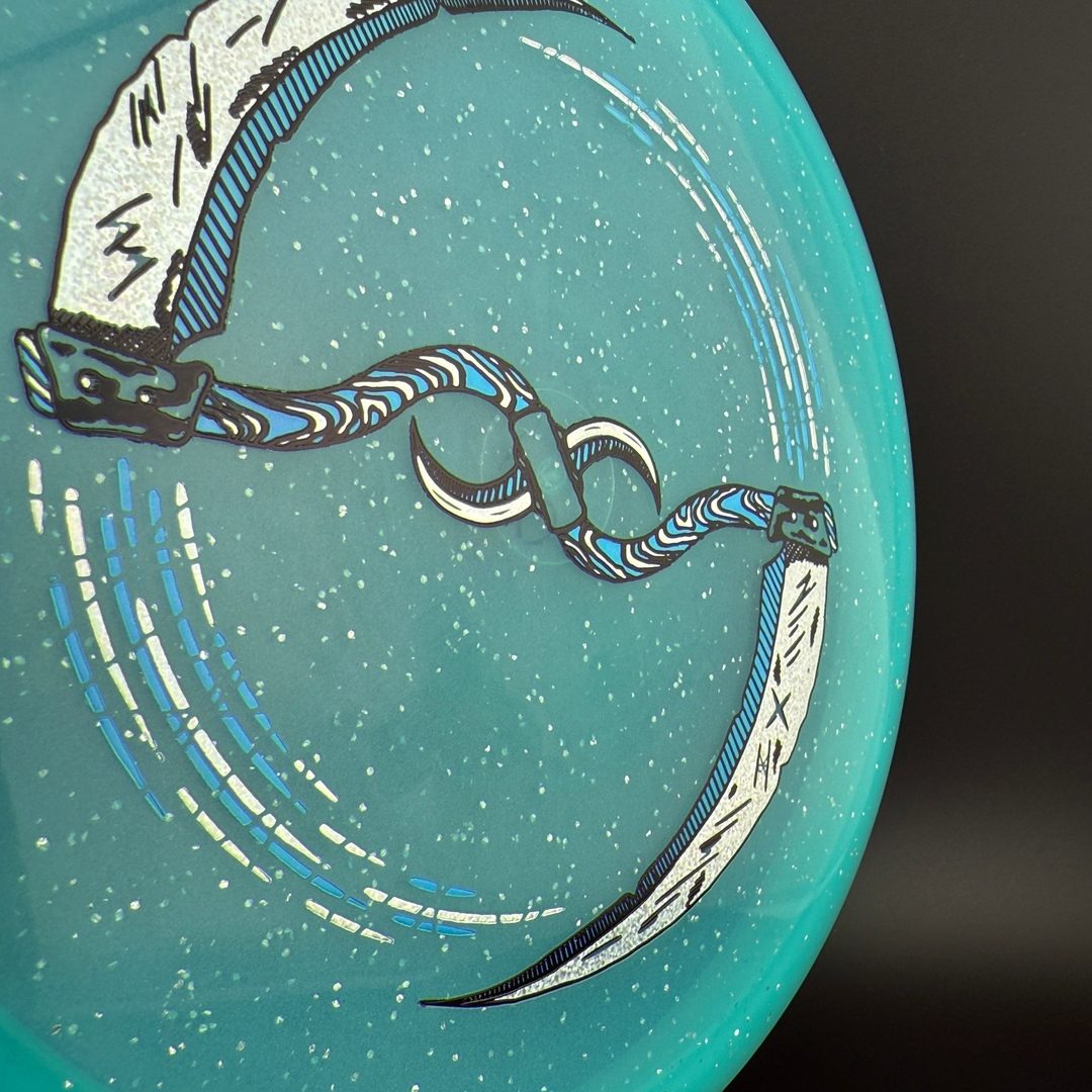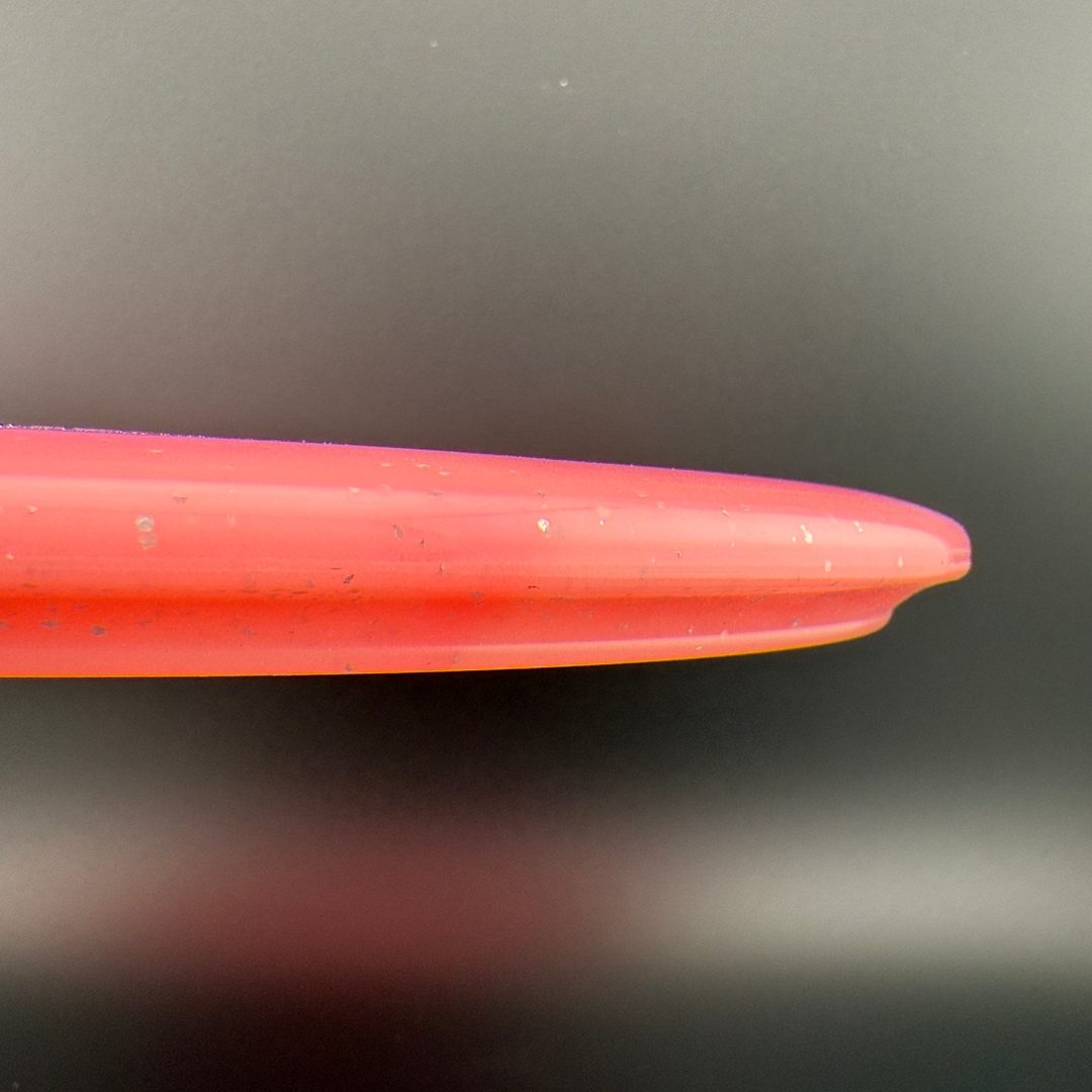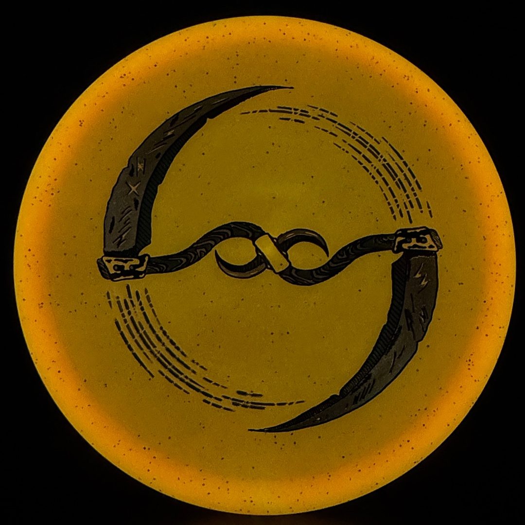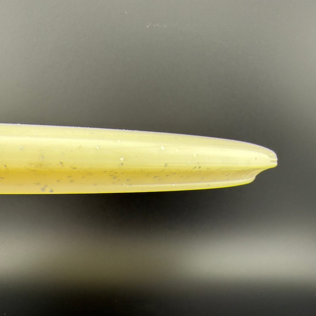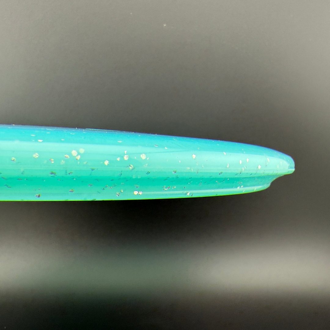 This is a Metal Flake glow-in-the-dark version of C-Blend plastic, which is the equivalent of Innova's Champion plastic. It is a semi-transparent, durable plastic that provides outstanding performance and long life. The Glow C-Blend can be either colored or traditional white glow and often feels slightly more gummy than typical C-Blend plastic.