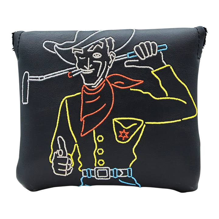 Howdy from the Hive! This black leather headcover features our winking cowboy golfer stitched into a stark neon sign design. The headcover includes a neon Tulsa, Oklahoma flag icon, a neon Bettinardi wordmark, and a neon "Milled in the USA Emblem". Limited quantities are available.