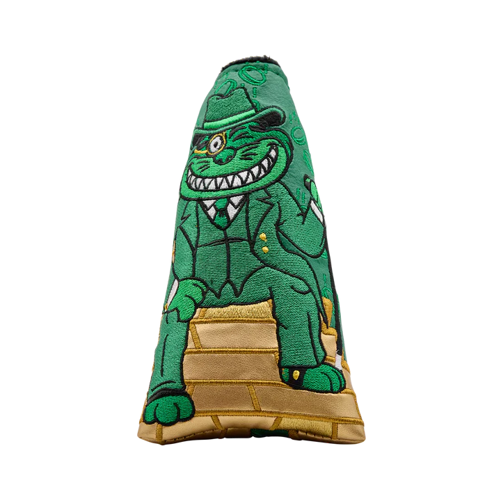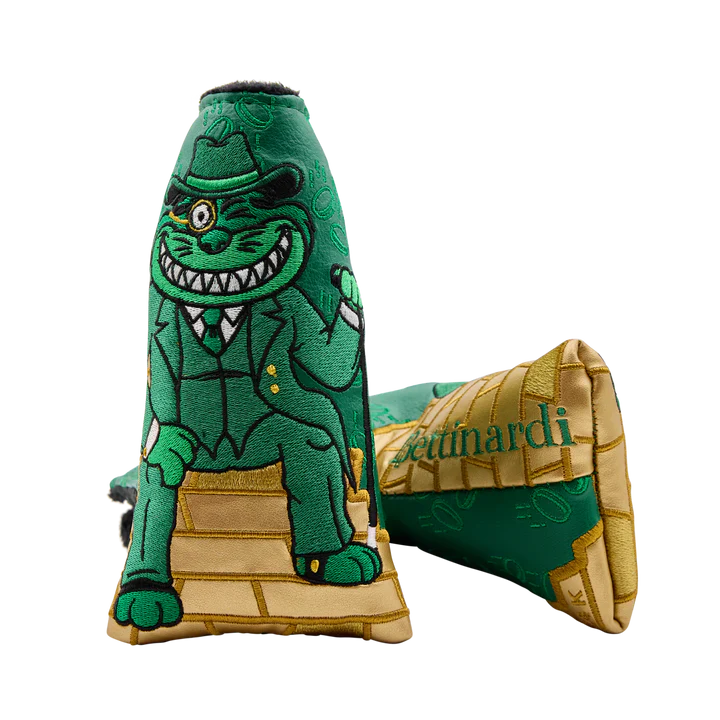The Gangster Cat is lounging on his throne of gold radiating a mix of wealth and intimidation. This blade putter headcover is featured on a green base with gold foil applique and finished with a black plush interior and magnetic closure.