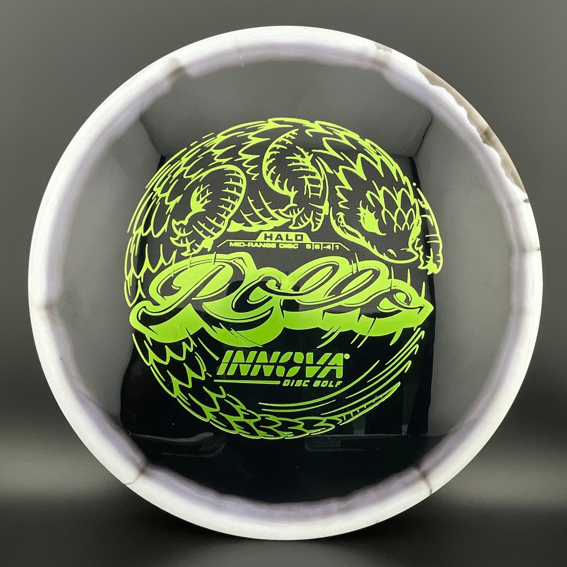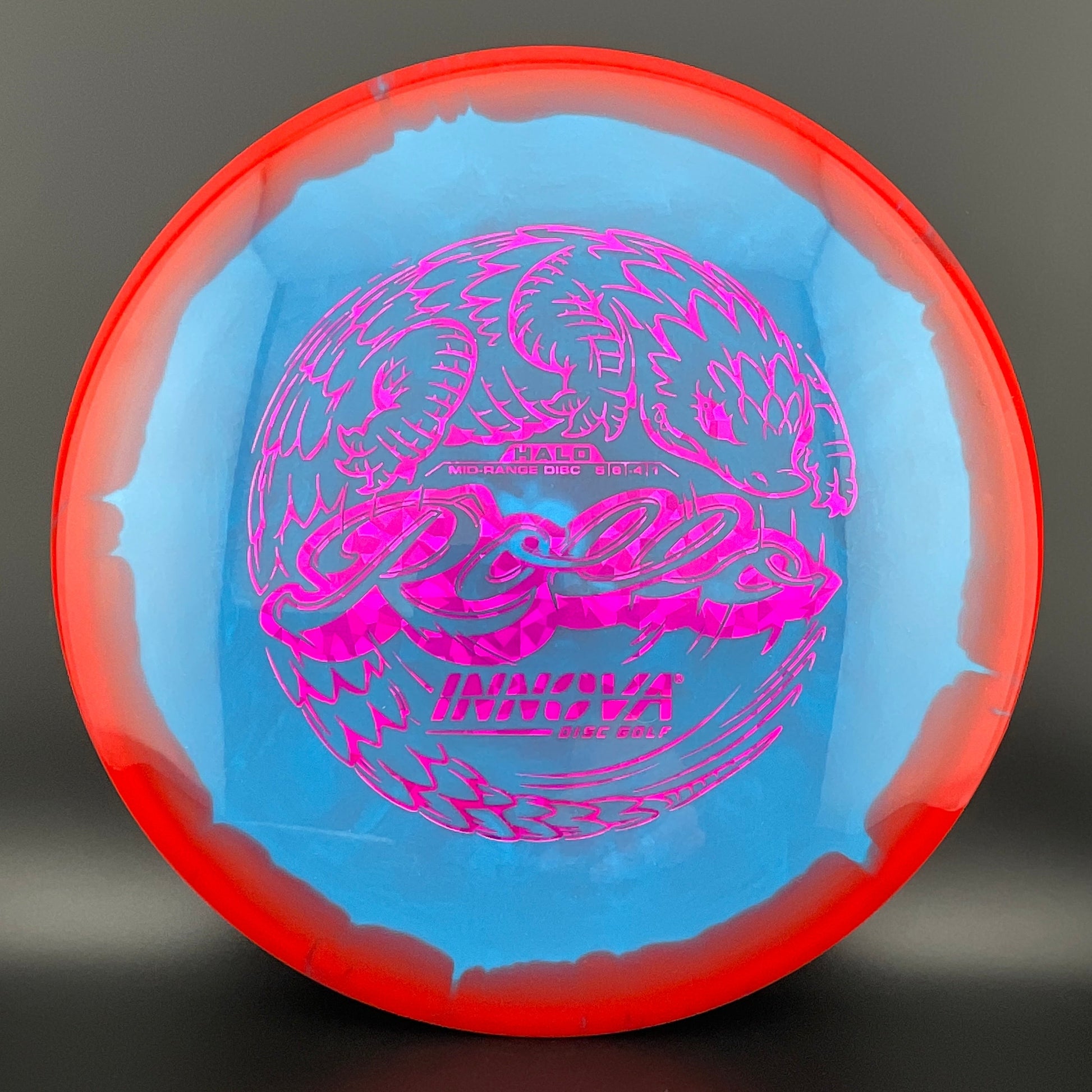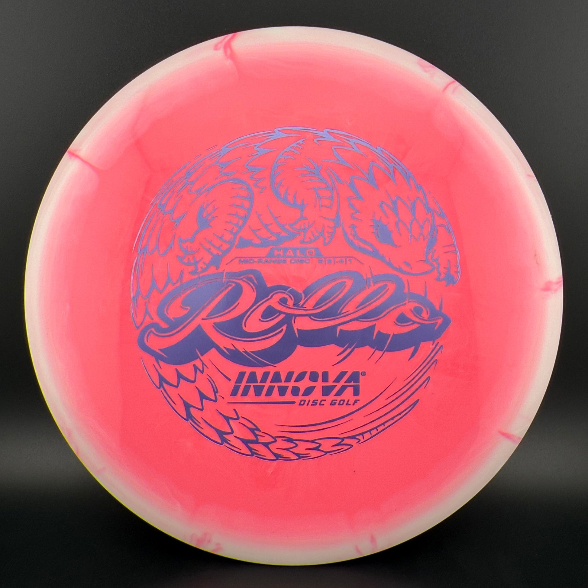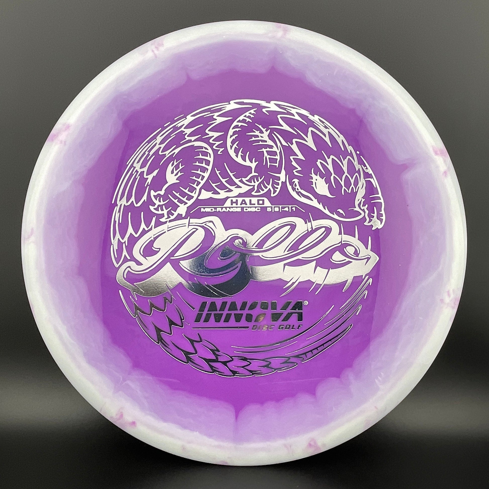 Halo Star is a decorative blend of Star plastic featuring a colorful halo design where the rim is a distinctly different color than the center plate of the disc. Halo discs are slightly more overstable to start than Star counterparts. The pearly rim is noticeably firmer than the Star flight plate - providing the disc with additional durability for a long lifetime of flight