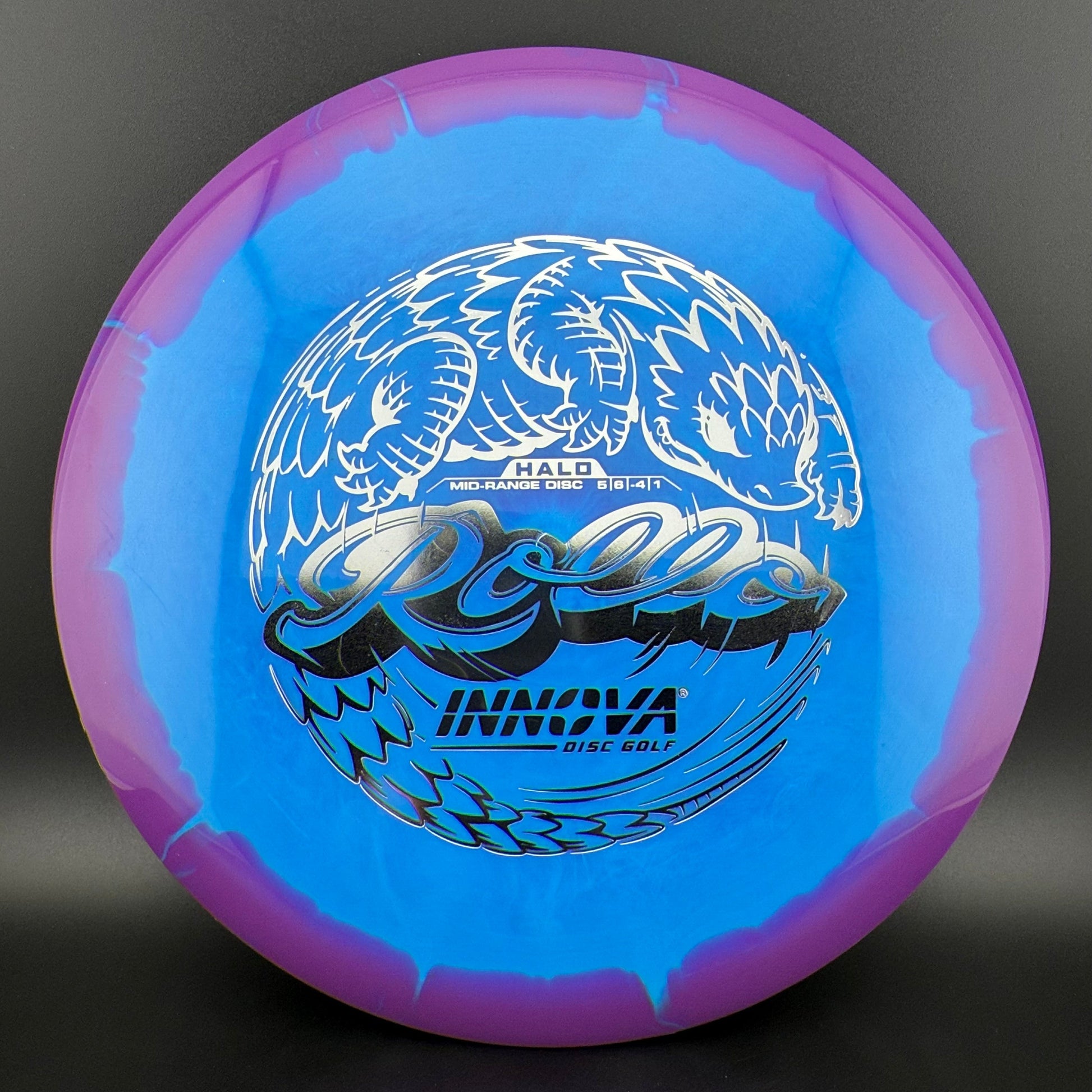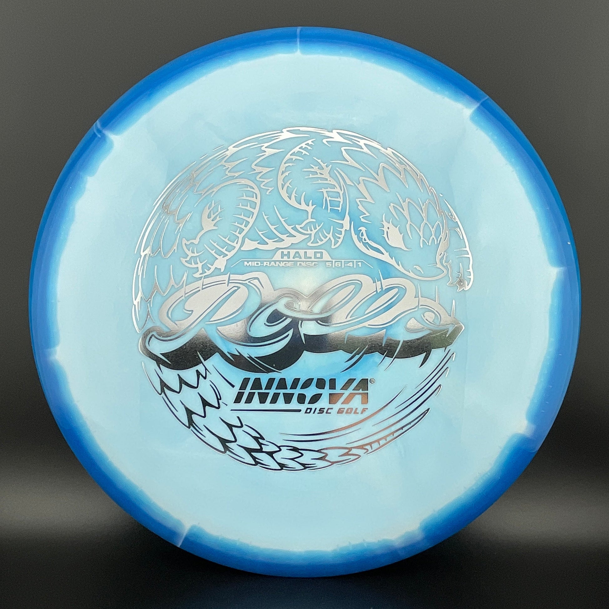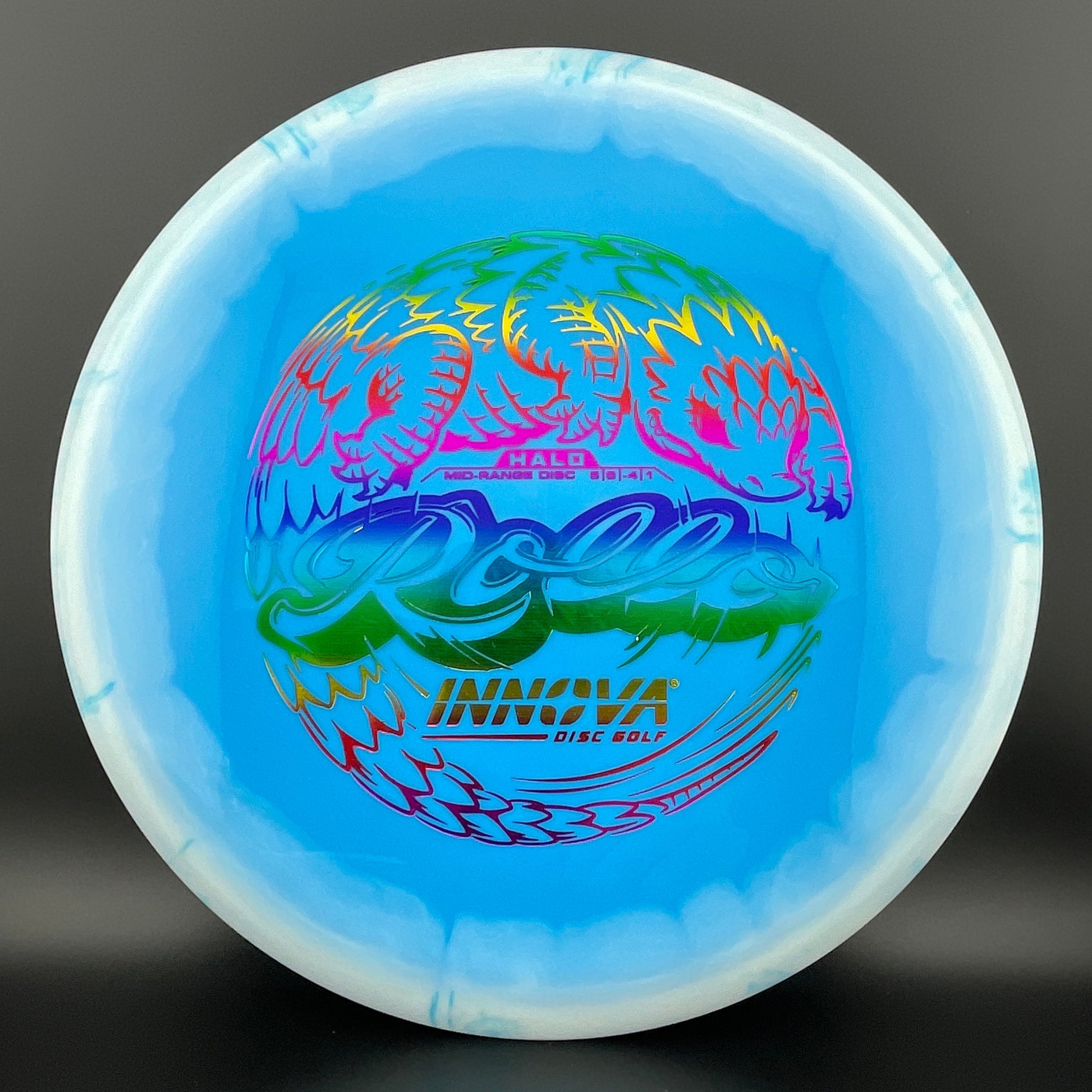 Halo Star is a decorative blend of Star plastic featuring a colorful halo design where the rim is a distinctly different color than the center plate of the disc. Halo discs are slightly more overstable to start than Star counterparts. The pearly rim is noticeably firmer than the Star flight plate - providing the disc with additional durability for a long lifetime of flight