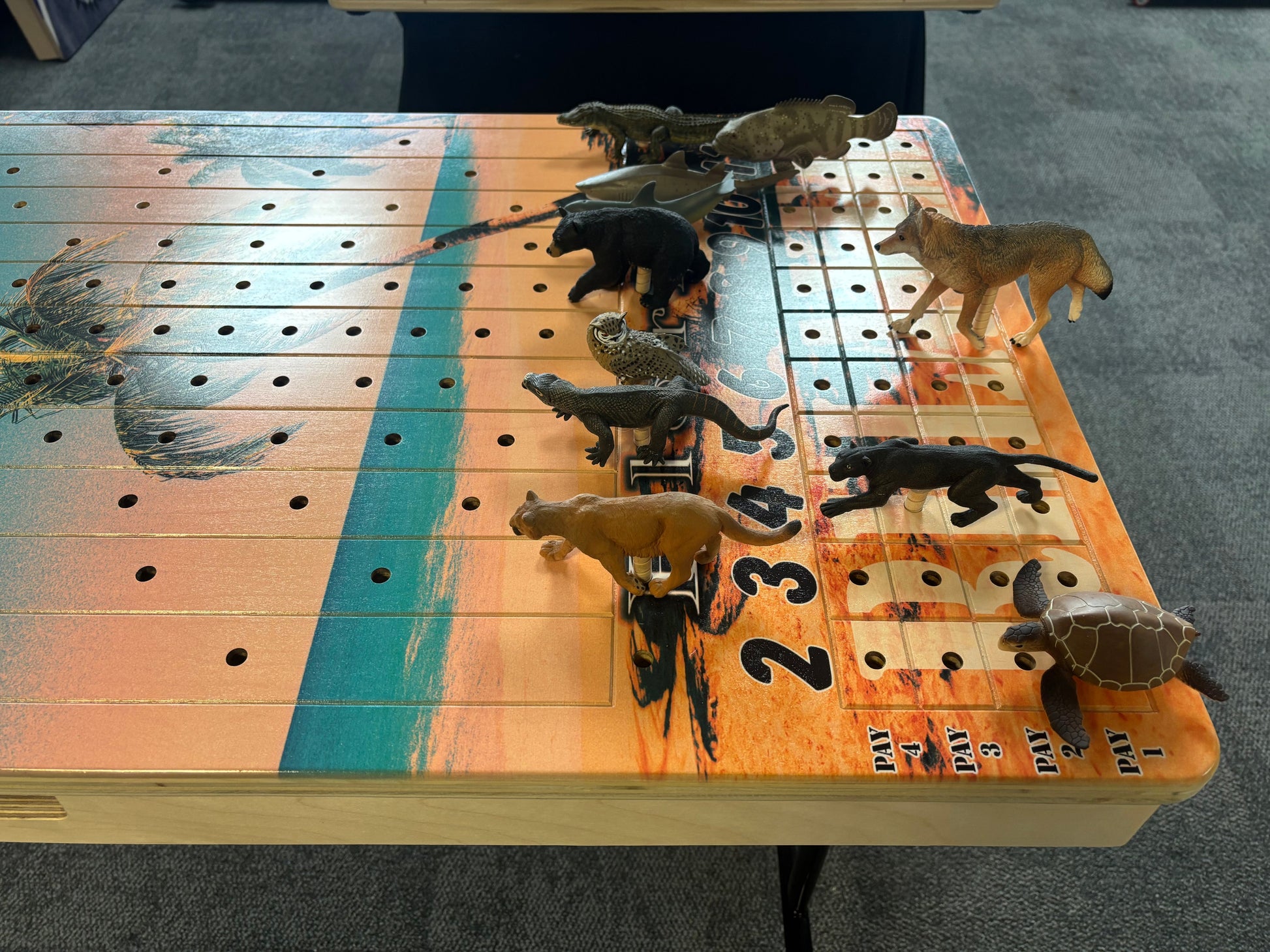 Beautiful custom printed (no decal!) on 1" thick Furniture Grade hardwood horse racing game involving dice, cards, gambling, and optional drinking spaces. The night will never end! This game is addicting, so proceed with caution! Have loads of fun with a group of friends and make sure you are in a place where you can get noisy! We make these boards out of high grade 1" furniture grade birch hardwood, CNC cut and engraved, before they are printed on a UV direct printer (right onto the wood surface (no decals or stickers). The design options are unlimited so let your imagination run wild as we can make it a reality with our high-tech equipment and machinery.