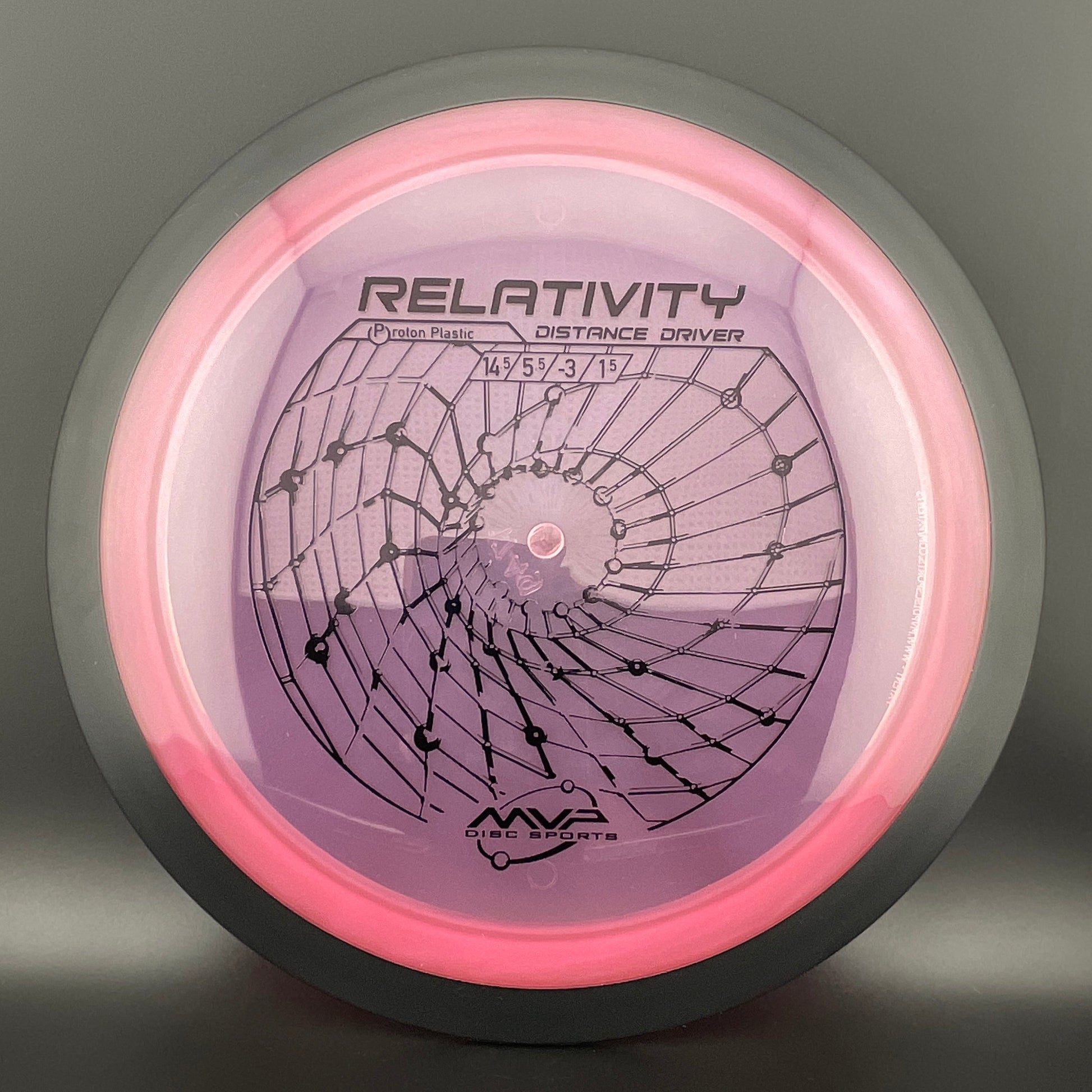The Relativity is the more understable distance driver of the 24.5mm "wide rim" class of drivers from MVP. The Relativity allows controllable turnovers, rollers, and high line distance shots. While the disc will normally land more on the understable side of its launch point, it's high-speed design forces an ending fade that can bring the disc out of unwanted turnovers.