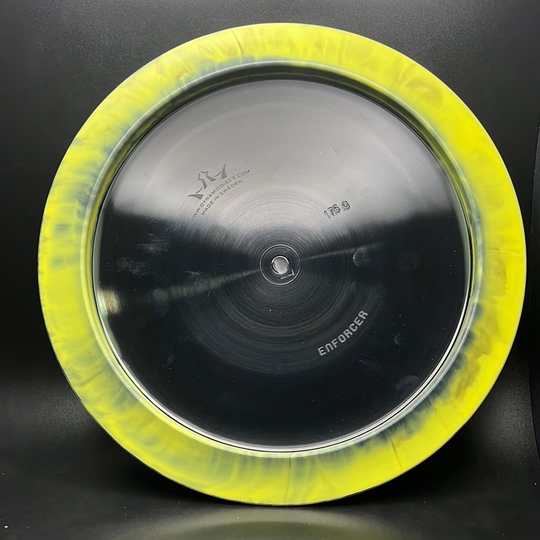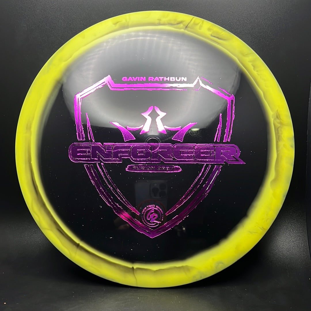 You no longer need to make a choice. You don't have to sacrifice distance in order to have stability. You don't have to fear flipping over when you need a big throw. The Enforcer mixes these two needs beautifully. It will fly great into a wind. It can be turned over for a very predictable S-flight. It is a wonderful disc for a spike shot. The versatility and predictability of the Enforcer has proven itself and is a staple in the bags of many world class professionals.