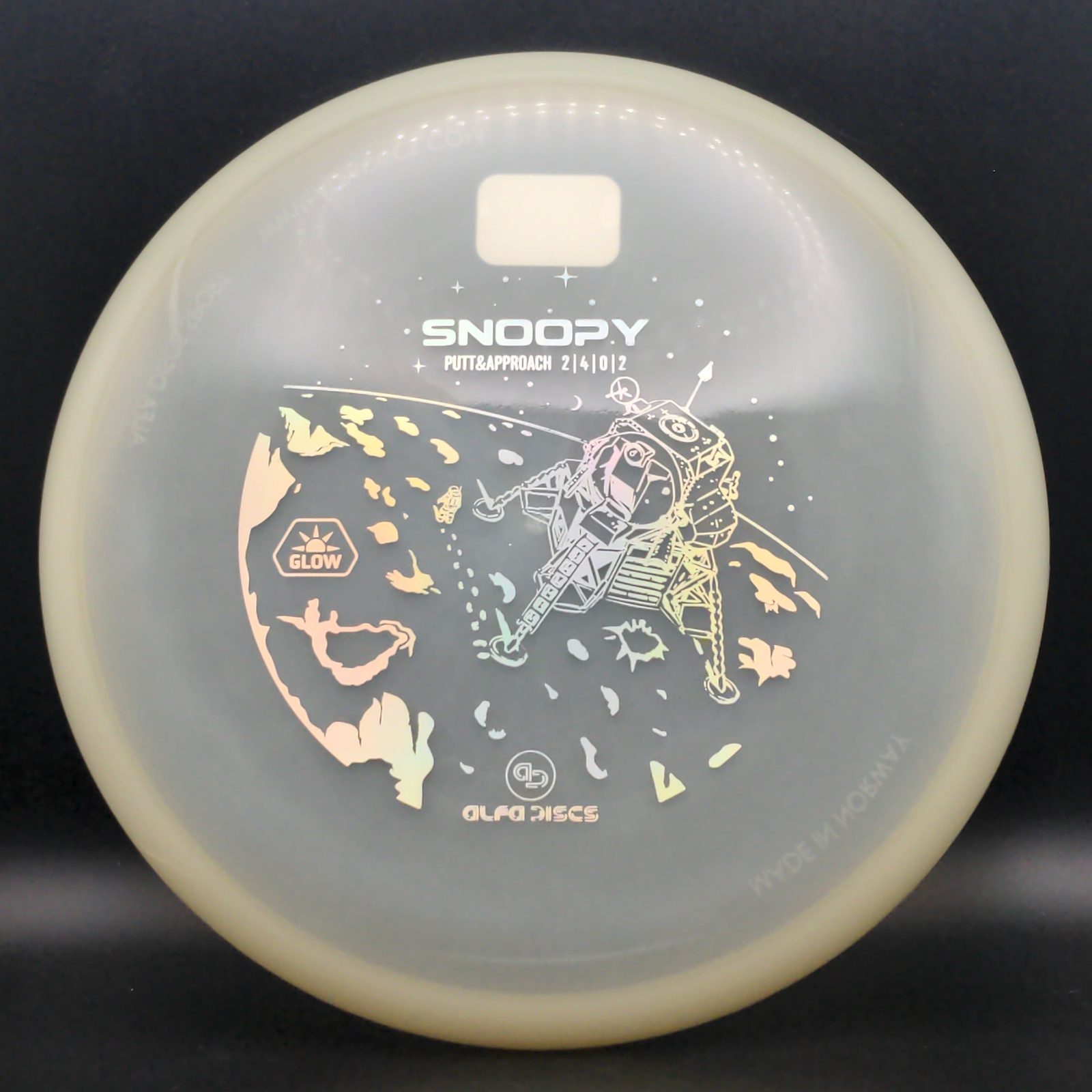 The Alfa Glow line is a premium blend similar to gummy Champion plastic. This Glow will brighten up the course when the course is dark. Don't lose your discs, use Alfa Glow! First Glow plastic from Alfa Discs. According to Alfa discs, this is one of the best glow plastics on the market and glows for more than 10 minutes.