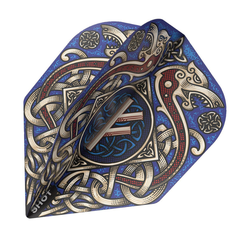 The Rannsaka flight shows the Fehu Rune symbol, an ancient Viking symbol of wealth and luck. This flight is hand drawn and designed by the Shot dartisans.