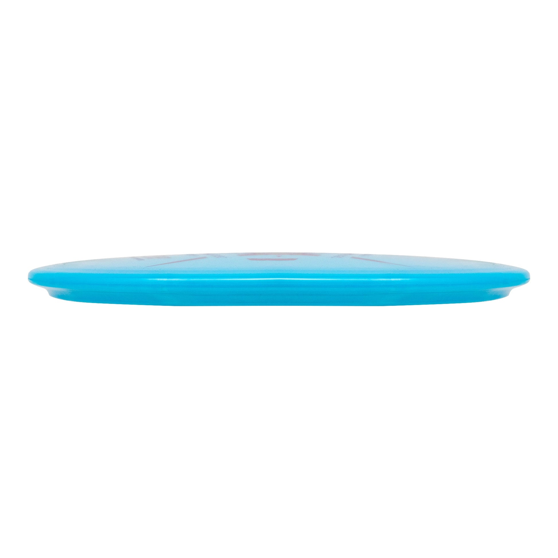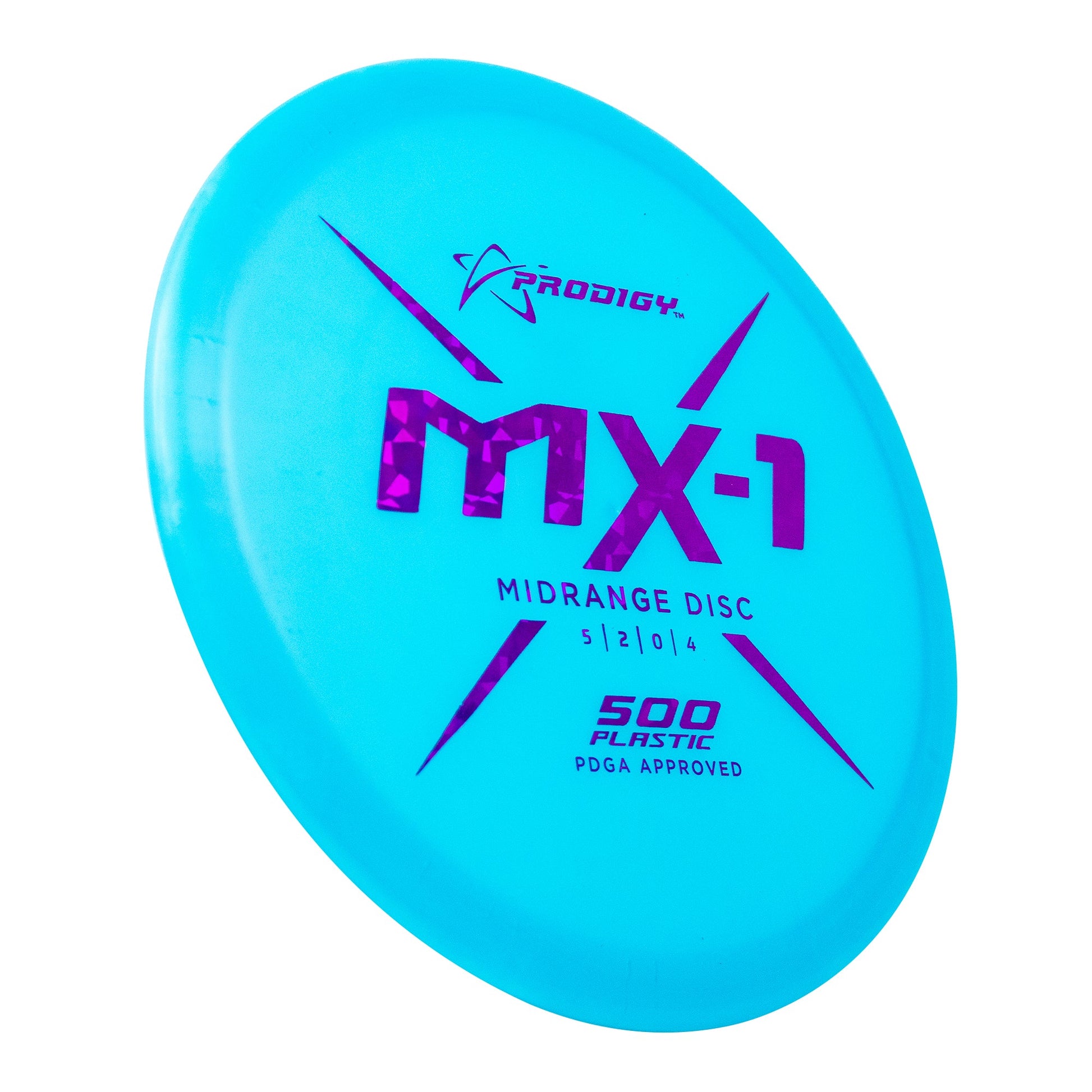 The Prodigy MX-1 is a very overstable midrange disc. It is designed to have a predictable finish no matter the release angle. Whether you throw it backhand or sidearm, the MX-1 can handle power and wind with no problem. In your hand, it feels similar to a beaded disc but doesn't have a bead, and its diameter is slightly smaller than traditional midranges.