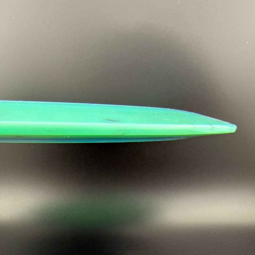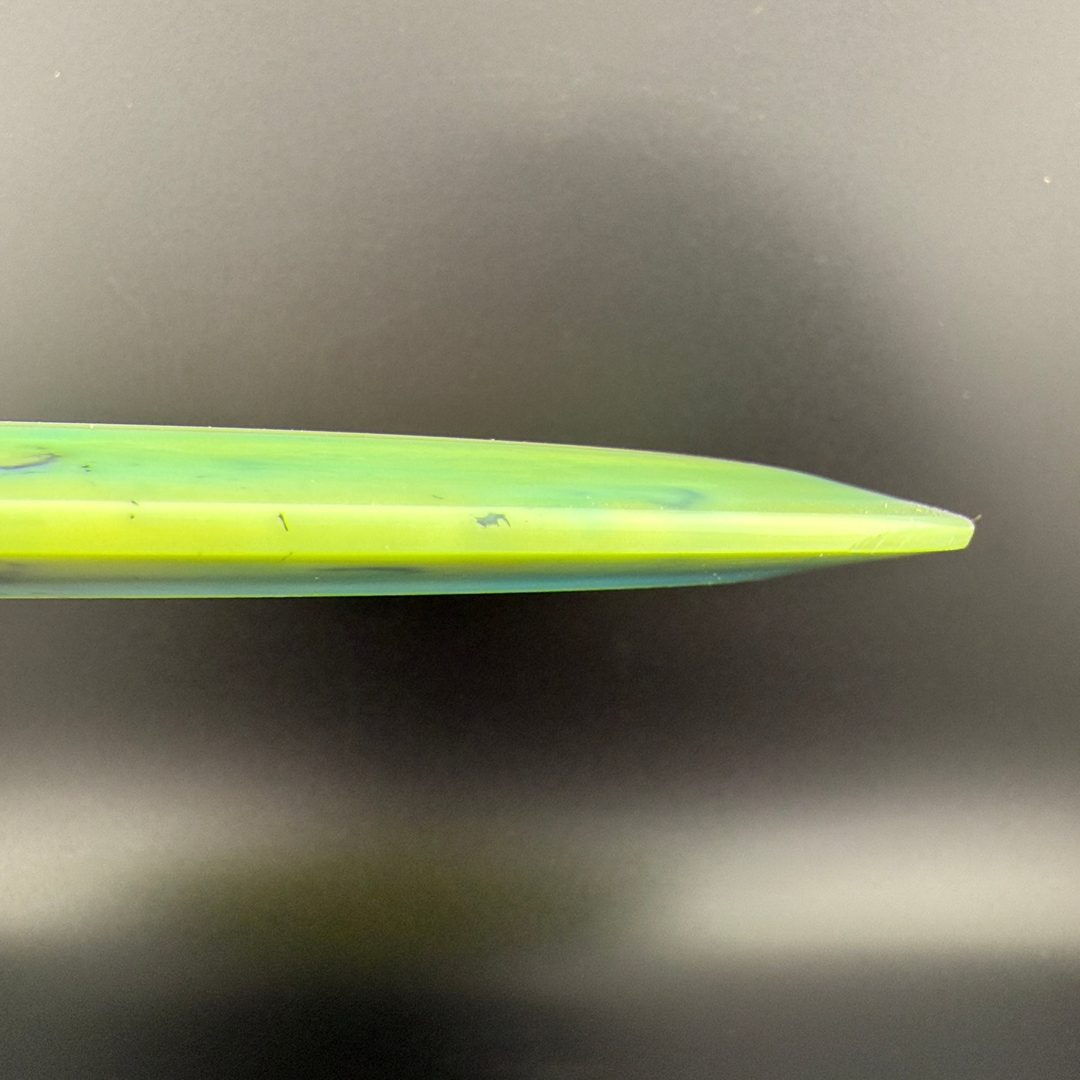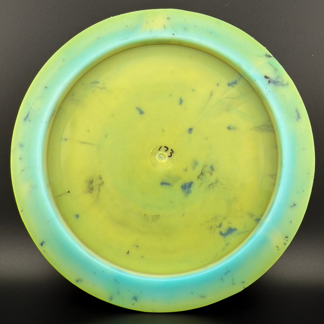 Toxic Waste plastic is a blend used in the Catastrophic Line by Doomsday Discs. It is a durable plastic with nice flexibility and grip. It can vary from being semi-transparent to completely opaque and is characterized by toxic splotches of black and other colors mixed into the blend.