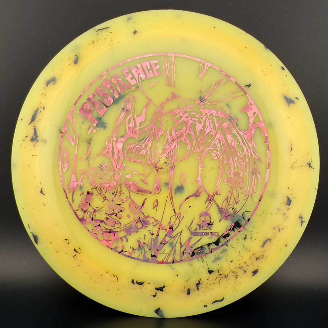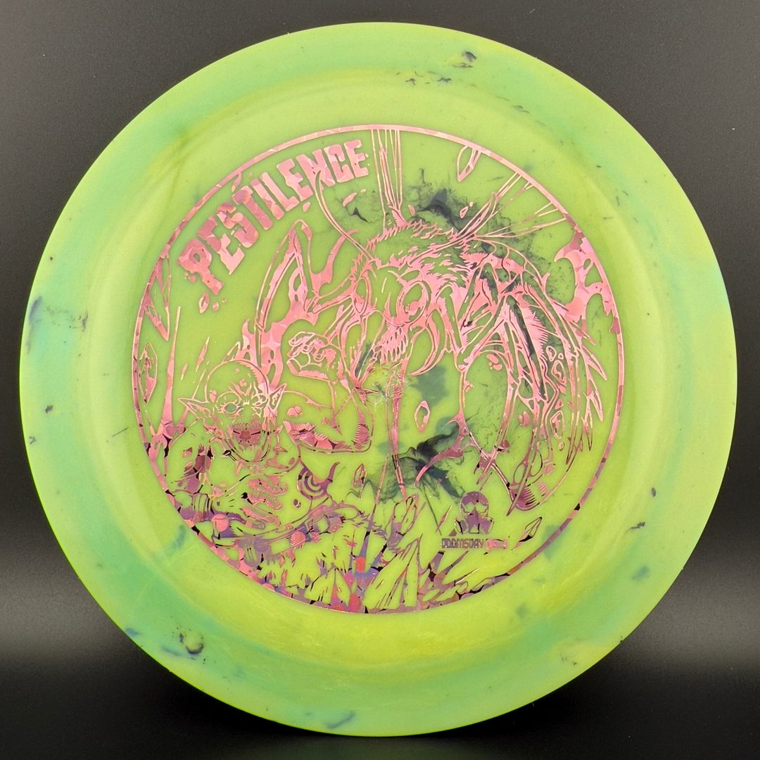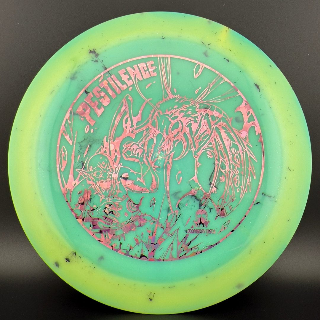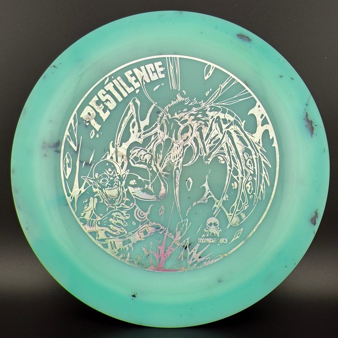 The Pestilence, by Doomsday Discs, is part of the Catastrophic Line of discs. It is a wide-rim distance driver that is understable enough to be handled by new players. For experienced players, it is an excellent tool for hyzer-flip and long s-curve shots. Reach your maximum potential on long throws without needing maximum arm speed or power. After the world comes crumbling down, you'll be able to use the Pestilence well into the dystopian future.