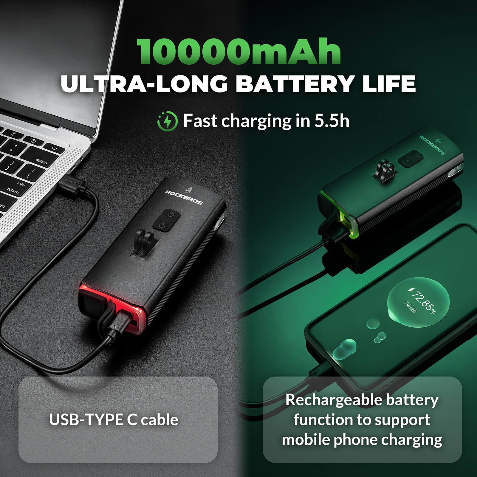 When the night falls and the road ahead fades into darkness, the ROCKBROS 3000 Lumens Hanging Bike Headlight keeps every ride clear and confident. Mounted beneath the handlebars, its suspended design minimizes vibration and maintains a steady beam across rough terrain. Whether you’re gliding through mountain trails or speeding along city streets, the 3000-lumen high beam lights up every corner with precision. The intelligent light sensor automatically switches between high and low beams, adapting to your surroundings for optimal visibility. With a 10,000mAh rechargeable battery and Type-C fast charging, you’ll have reliable power for every long night ride. More than just a headlight — it’s your trusted companion for conquering the dark.