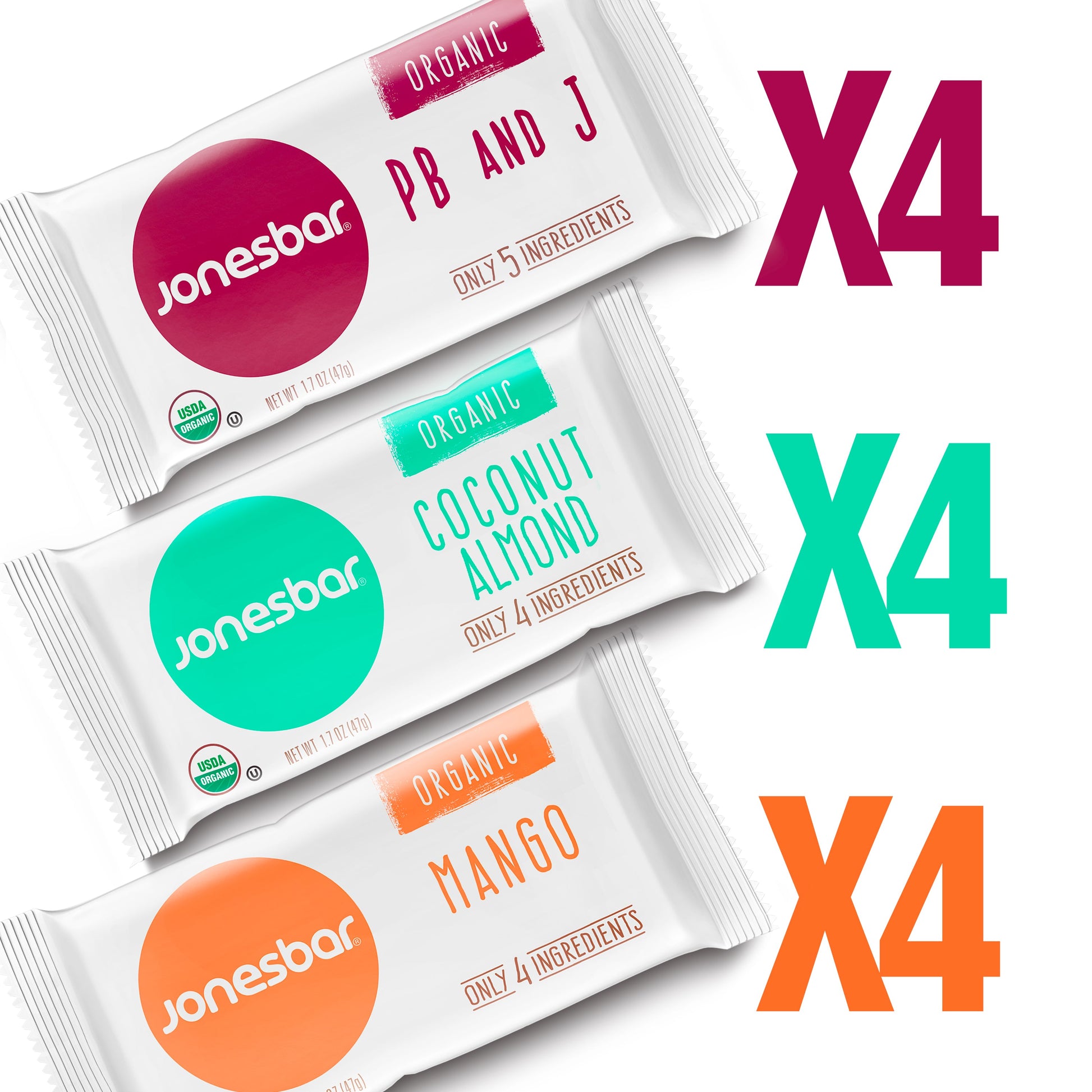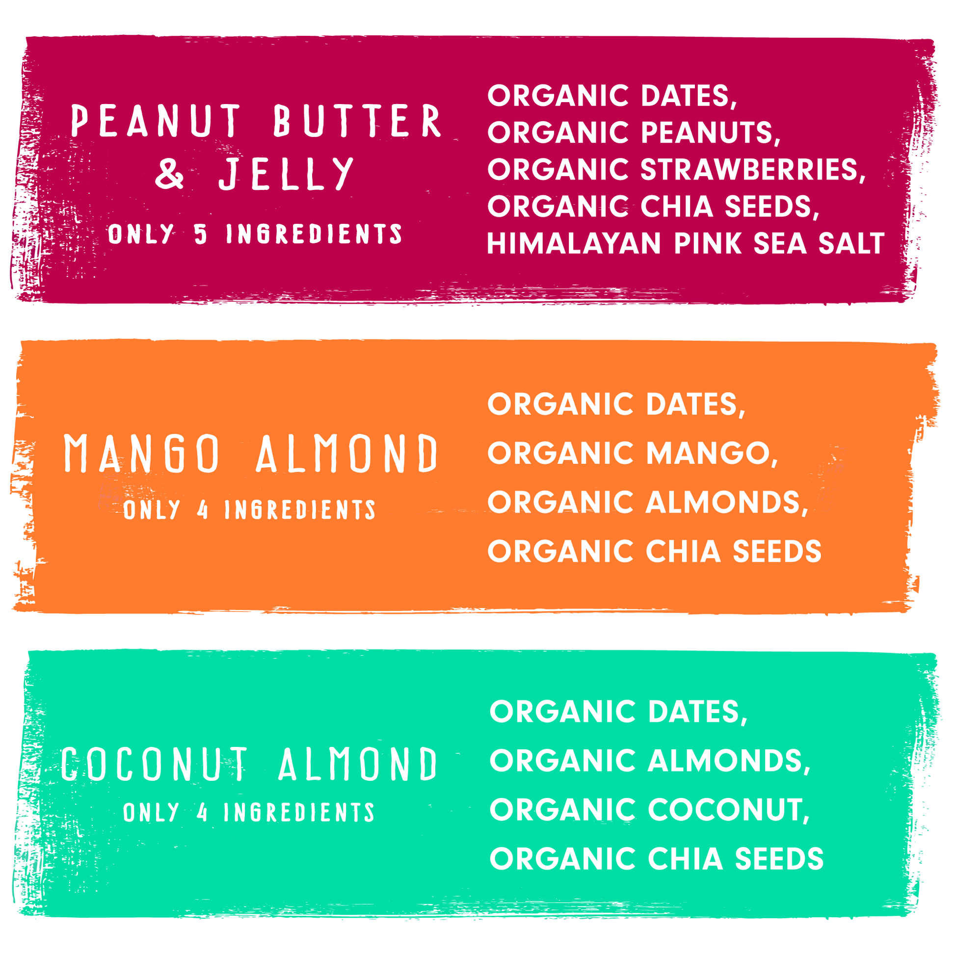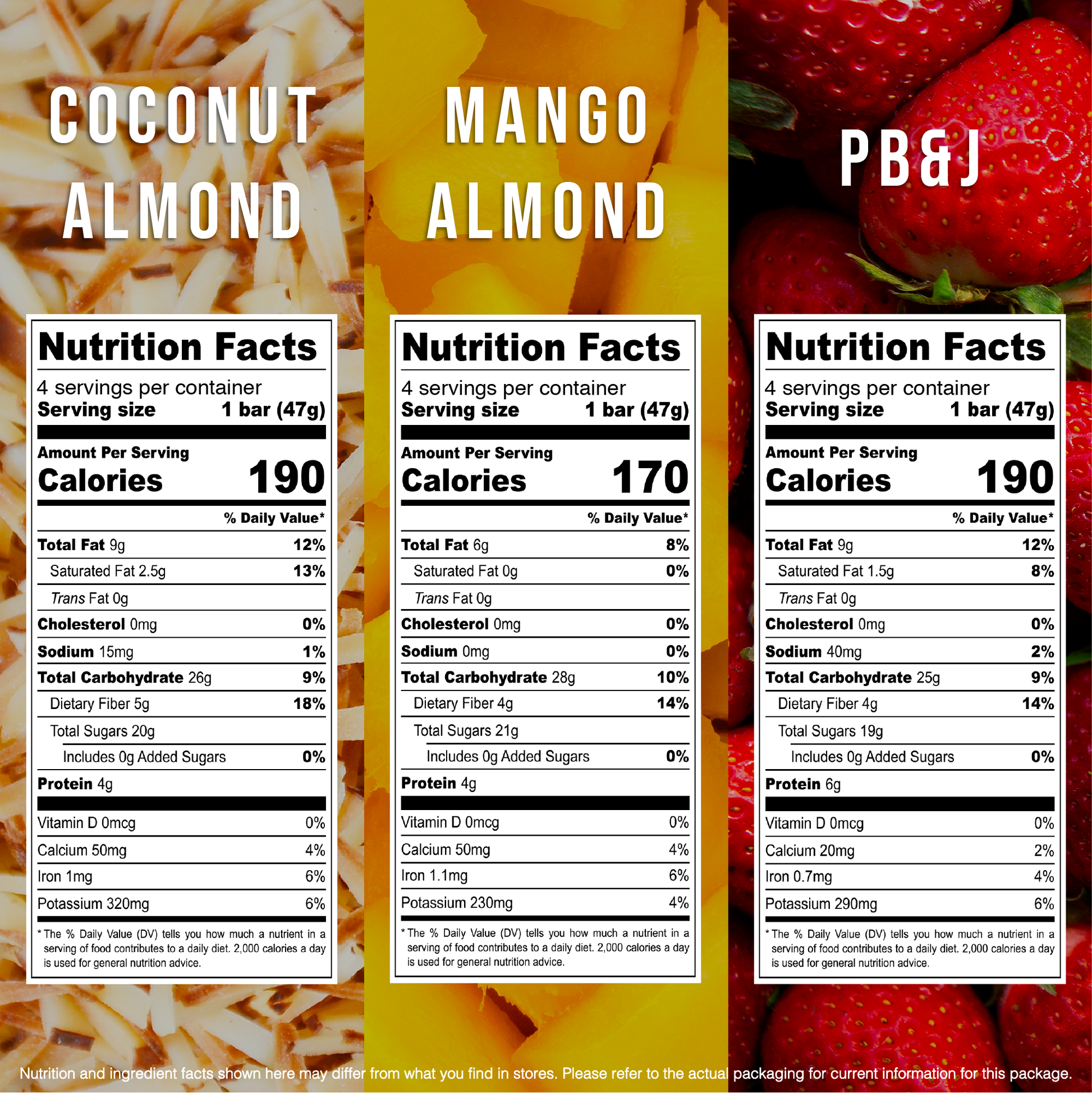 Variety Pack includes: 4 PB&J, 4 Mango and 4 Coconut bars