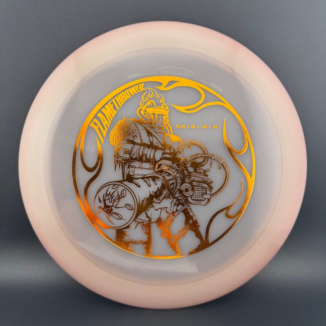 The Flamethrower is a slightly overstable distance driver from Black Zombie. Black Zombie describes it as "a perfectly seasoned Wraith" that "booms even for players with slower arm speeds". The Flame Thrower is very glidey and can be used for long anhyzers that finish with a touch of fade. It's also a nice option for forehand drives and long thumbers.