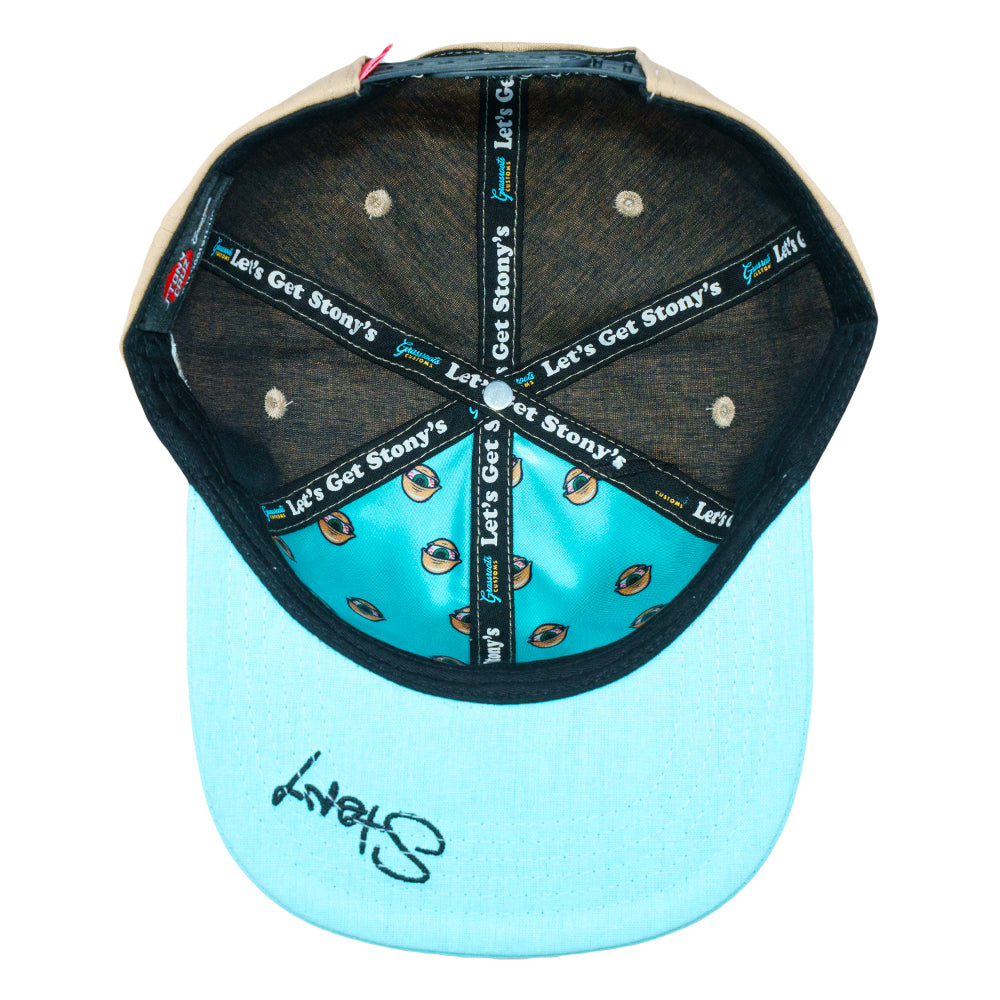 The Stonys Reserves Beige Snapback Hat is a new laid-back piece for those who like to keep it lifted. This beige snapback with a baby blue brim features custom embroidery on the front and side, bringing subtle style with a nod to ganja culture. Finished with an adjustable OSFM snapback fit, it is easy to wear and made to chill.