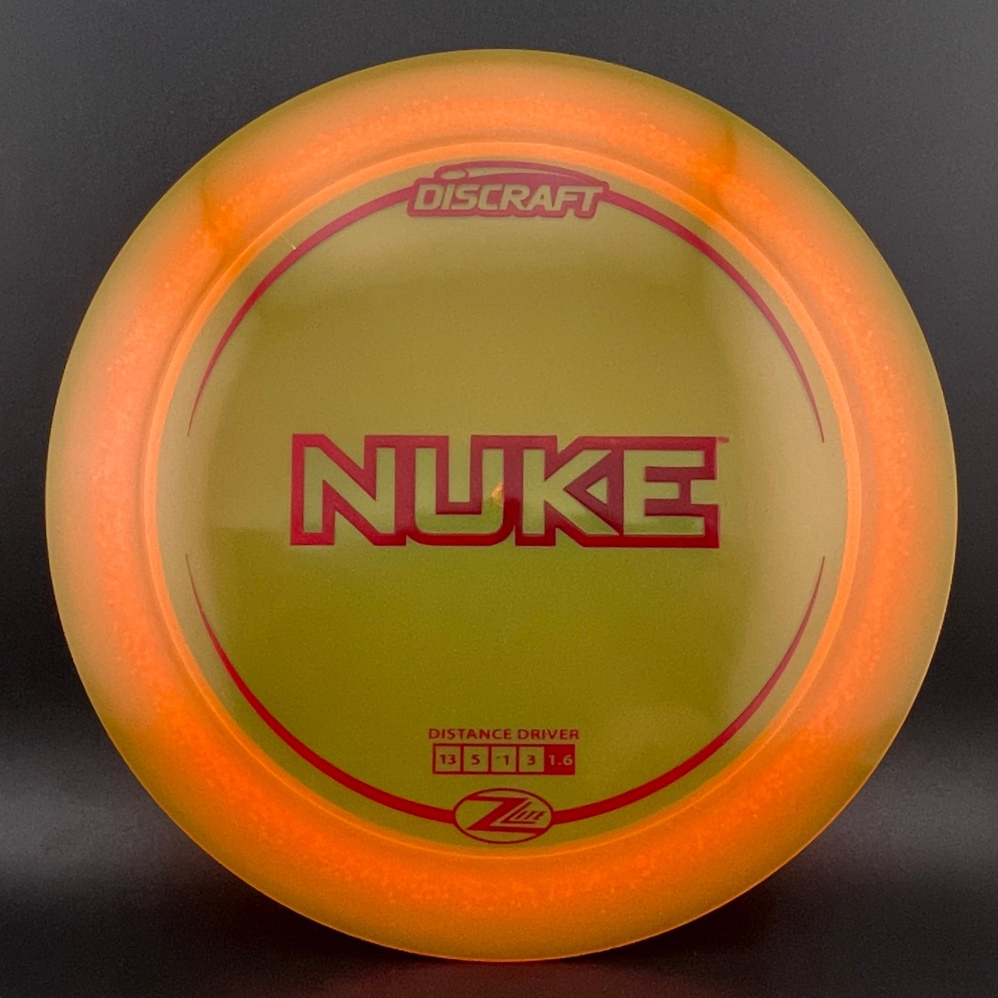A Nuke is a distance driver that is designed to fly really far! The wide rim ensures good flight properties and a good grip so there is room to really rip it. Experienced players will experience an easy turn before the disc continues into a reliable fade.