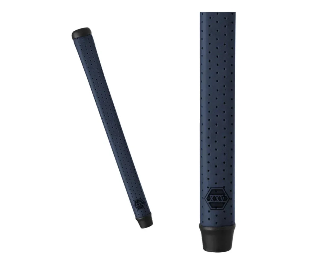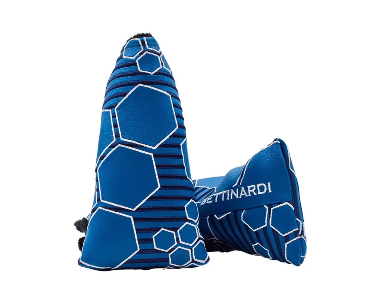 Introducing the fifth putter of our 25th Anniversary Commemorative line, our ever-popular Queen B 6. This 363-gram Limited Run QB6 features a Tour Blast finish and FIT over Flymill face. The unique combination also features a highly sought-after one-piece milled Plumber’s neck, offered for the first time on a Queen B 6 head. The heel features an open Hex milling with Roman numerals “XXV” to emphasize the significance of this milestone putter, while the sole showcases a floating hex pattern and the bumpers include a “1/250” engraving to mark its limited quantity. This classic Bettinardi wide-body blade features a minimal paint scheme of royal blue and white and comes paired with a Royal Blue leather 25th Anniversary headcover and a Navy Blue 25th Anniversary Gripmaster perforated leather grip with white stitch back.