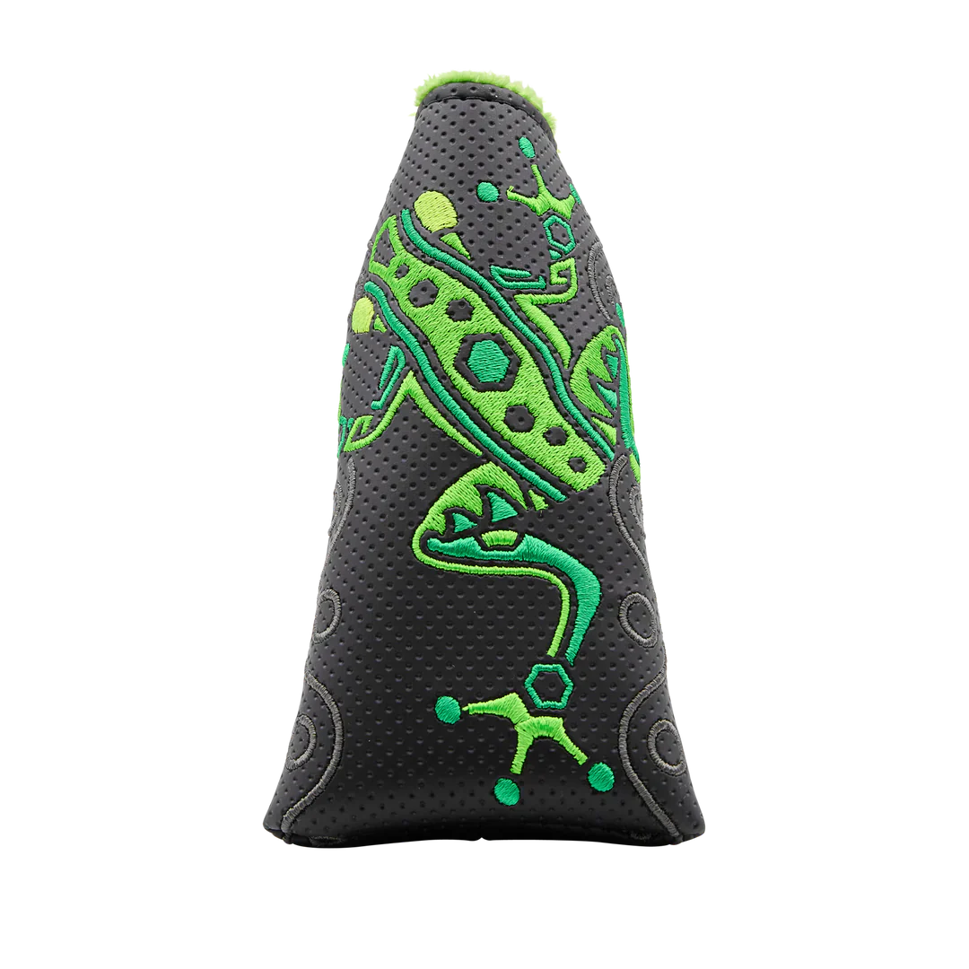 Start off the 2025 golf season with Robert J. Bettinardi's first Limited Run putter of the year! This Tiki masterpiece is crafted from 303 Stainless Steel in the iconic BB1 Slant Neck head shape, featuring a one-piece milled slanted plumber's neck and a floating ghost face accented with intricate Tribal design. Its stunning Black PVD finish is highlighted by a Tribal Tree Frog design on the sole with green and yellow accents. Weighing in at 360-grams, this precision-milled BB1 offers 1/2 toe hang and comes complete with a black and neon green Lamkin Deep Etched Smooth Pistol grip and a custom Tribal Tree Frog magnetic headcover.