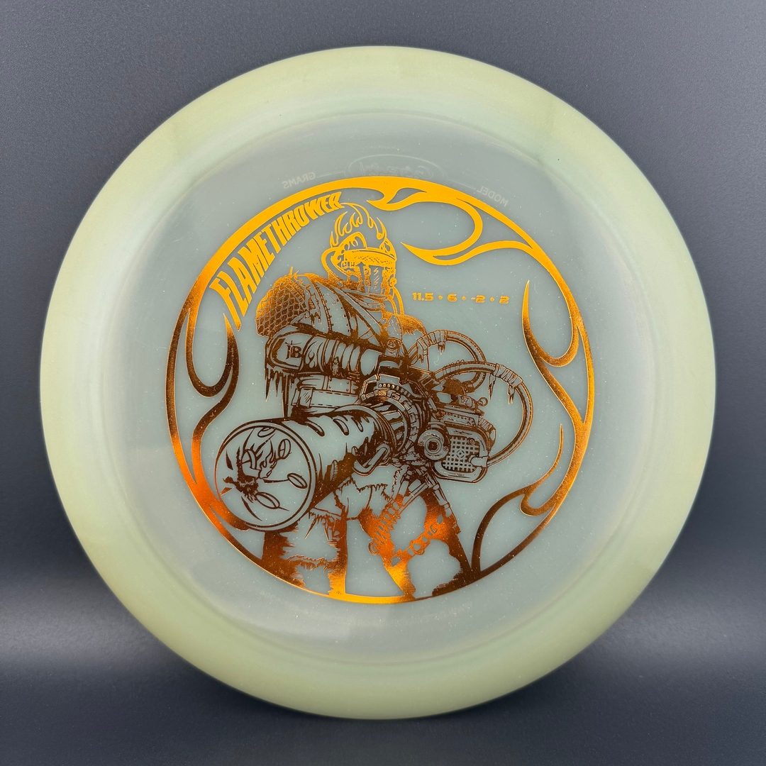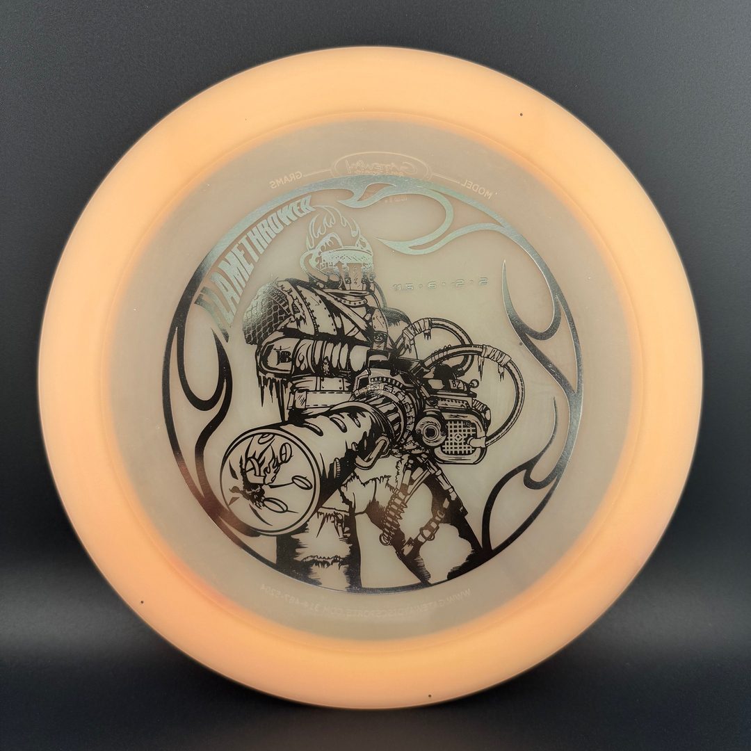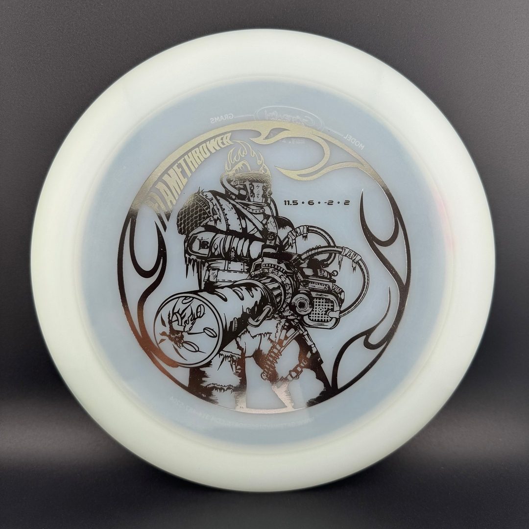 The Flamethrower is a slightly overstable distance driver from Black Zombie. Black Zombie describes it as "a perfectly seasoned Wraith" that "booms even for players with slower arm speeds". The Flame Thrower is very glidey and can be used for long anhyzers that finish with a touch of fade. It's also a nice option for forehand drives and long thumbers.