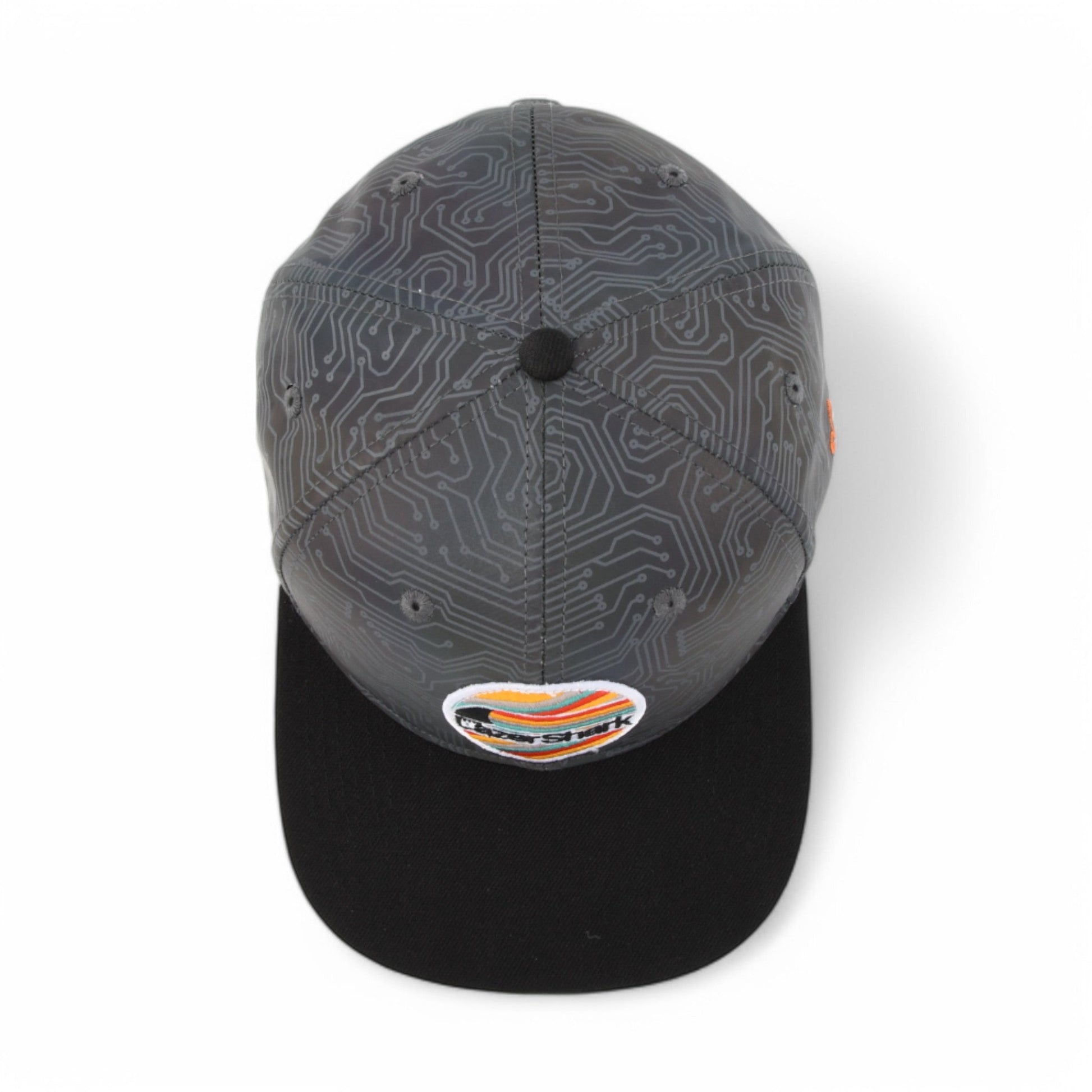 These hats use reflective material on the exterior of the hat, highlighting the circuit board design with a fun reflective material to really make the hat pop