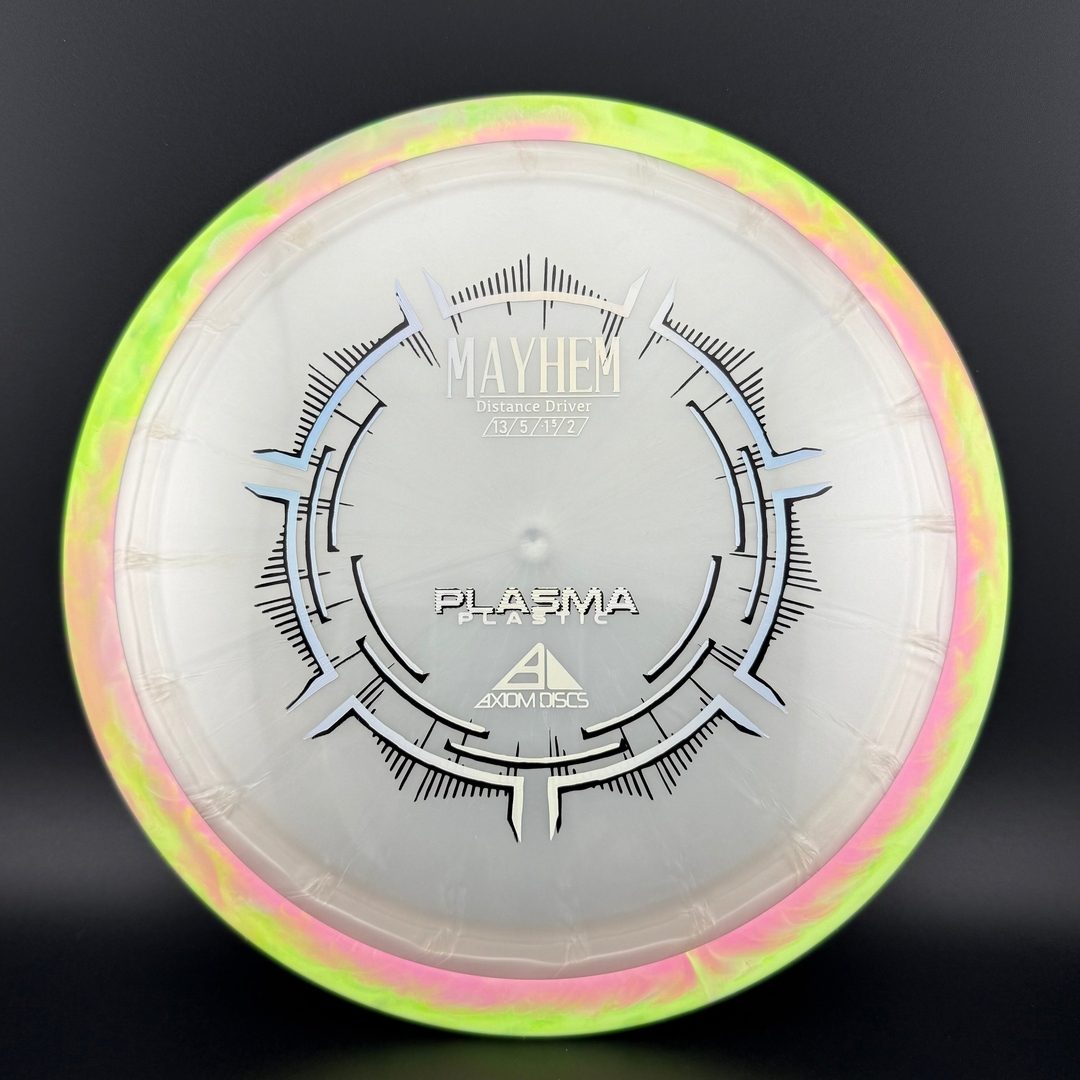 Mayhem has a responsive straight-stable profile and plenty of speed, making it a perfect workhorse driver for many advanced and expert throwers. Like the MVP 23mm class, the Mayhem has a pronounced dome to promote distance-covering glide. Mayhem is best compared to a beat MVP Octane.
