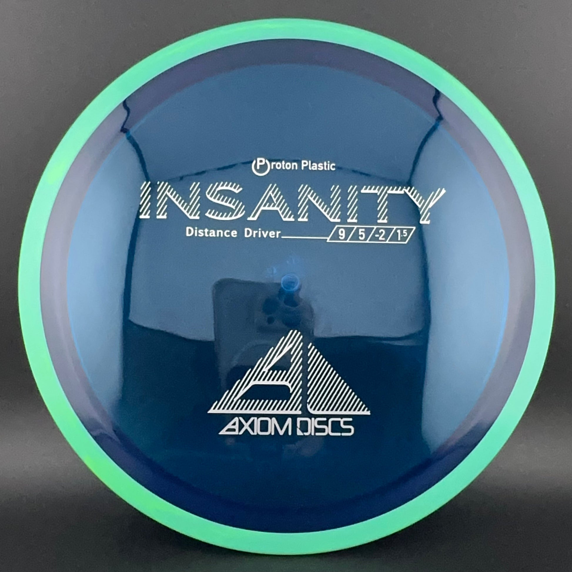 The Insanity was Axiom's first distance/control driver. This disc is slightly less stable than the ultra popular MVP Inertia. The Insanity flies like a longer crave, and will provide straight as an arrow flights for intermediate players, and slightly understable turnovers for power players.