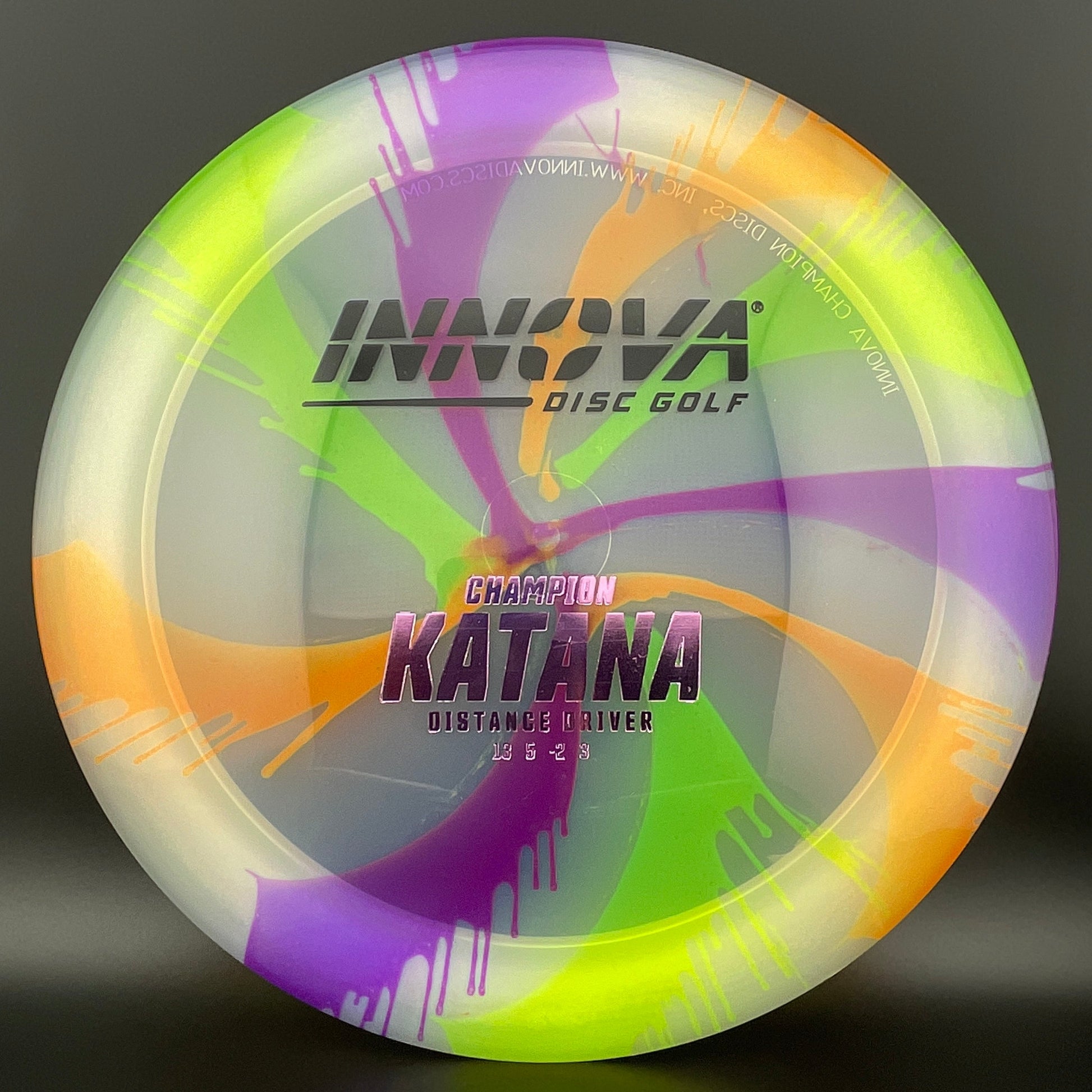 The Katana is an amazing high-speed distance driver with major turn and fade. The Katana will move through the air like no other disc. This speed-13 driver has an incredible degree of high-speed turn (3) followed by major low-speed fade (3). Innova says this disc has “flight characteristics of the Sidewinder on steroids.” The Katana is capable of making huge turnover throws, and sailing for maximum distance.