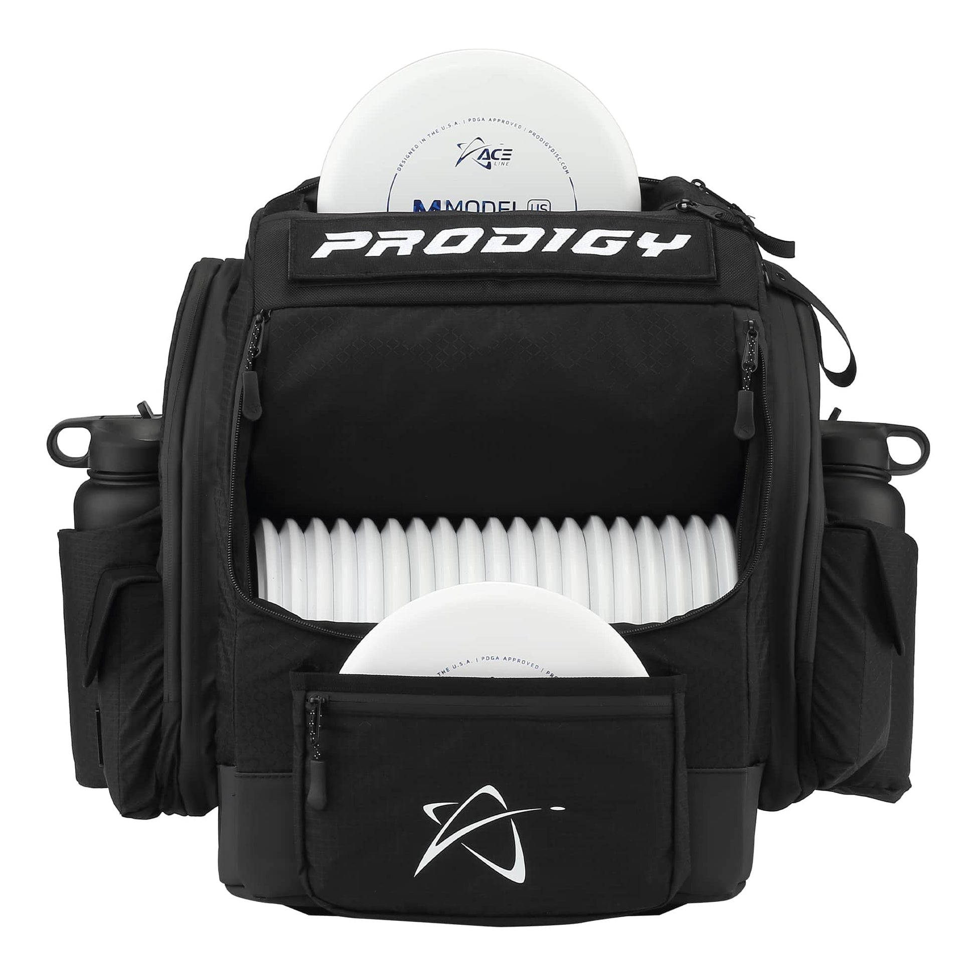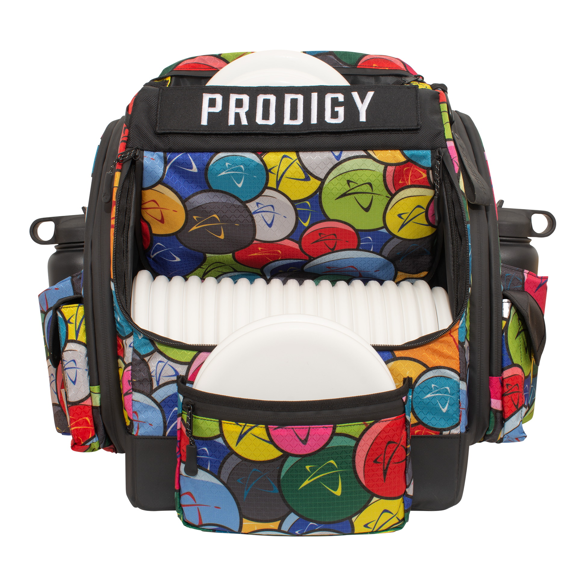 The patch includes Prodigy branding but can be customized to add a personalized flair to your bag (not included) along with the all-new color array to help you stand out on the course. You can still fill up the main compartment with more 20+ discs and then put your favorite pair of putters in the front putter pocket, which now includes a sleek, debossed pull tab. There's plenty of extra room in the large top pocket that can fit 4 putters or other accessories, and the expandable side pockets can be used for discs, snacks, towels, and even extra gear. The water-resistant zippers, magnetic easy access pockets, umbrella sleeve, and insulated 32 oz. bottle holders also provide extra convenience.