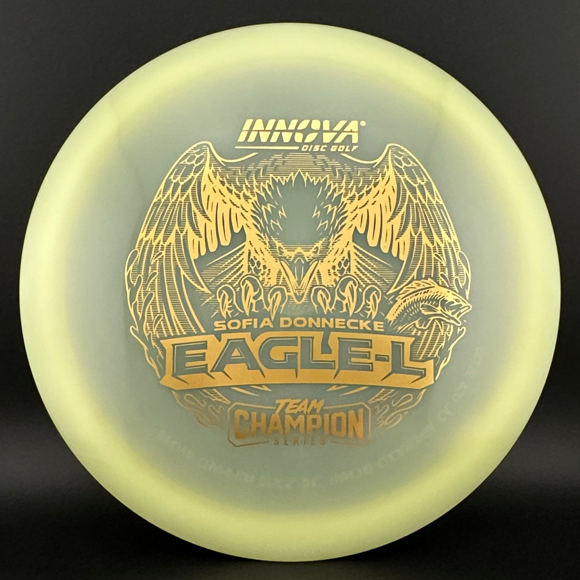 7/5/-1/2  *Staff Favorite!  We are stoked they brought back the Eagle-L!  And in the brightest glow plastic around.  Minor variation possible, multiple available.  The Eagle L is the less stable counterpart to the Eagle X - hence the 2 fade while the more overstable Eagle-X has a 3 fade.