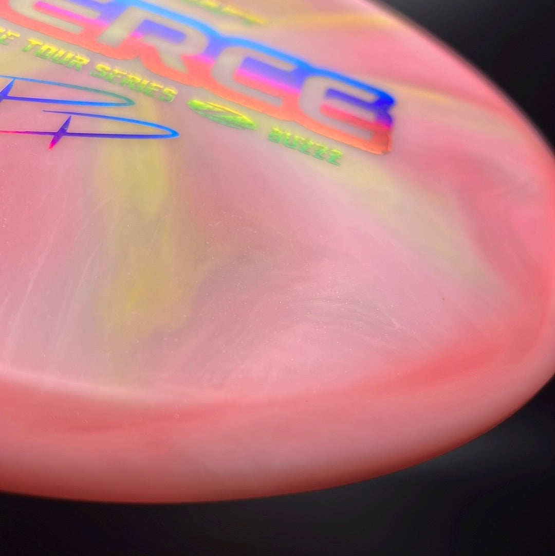 The Z Swirl Tour Series plastic brings its signature, translucent swirls to this run of the Buzzz. Expect this to be slightly more overstable than the standard Z run, but with added tackiness for grip. The Buzzz is the straightest midrange on the market and is the most popular disc in the world.