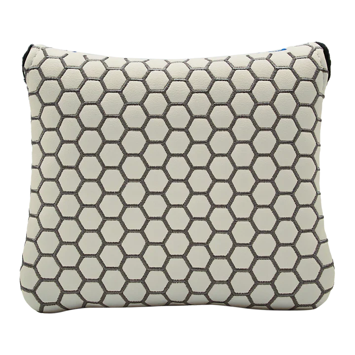 Robert crafted his new INOVAI 6.5 Spud neck with a combination of the finest American 303 Stainless Steel and Military Grade 6061 Aluminum. The Tour Blasted front piece includes our F.I.T. face milling for the softest feel at impact, ideal for the player with an aggressive putting style. The Gun Metal Gray Anodized back piece includes muscular fangs that form a perfect hex cut-out and stark sightlines that provide alignment visuals to help keep the putter head moving toward the target. The two triangular vents help optimize the MOI and the 5-plane sole helps the putter sit beautifully at address. This putter was precision-milled to 354 grams & features a Honeycomb milling pattern on the sole that completes the trademark Bettinardi look. The INOVAI 6.5 putter features a sleek gray, blue, and white color scheme and comes perfectly paired with a matching white & gray honeycomb headcover and a blue Lamkin grip.