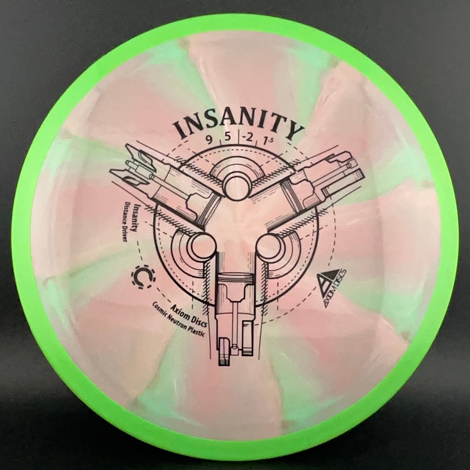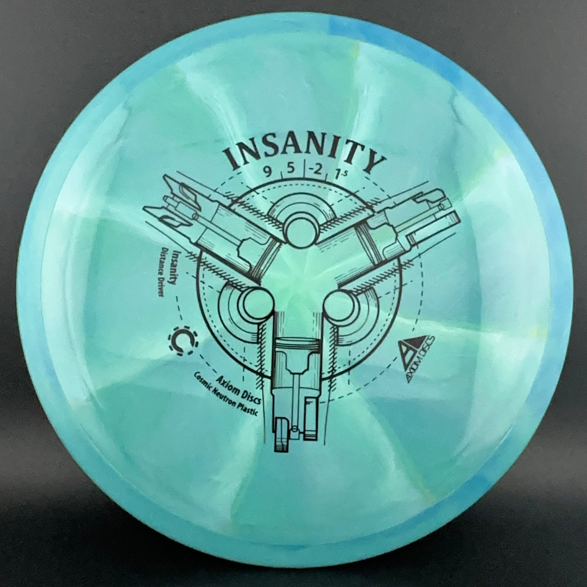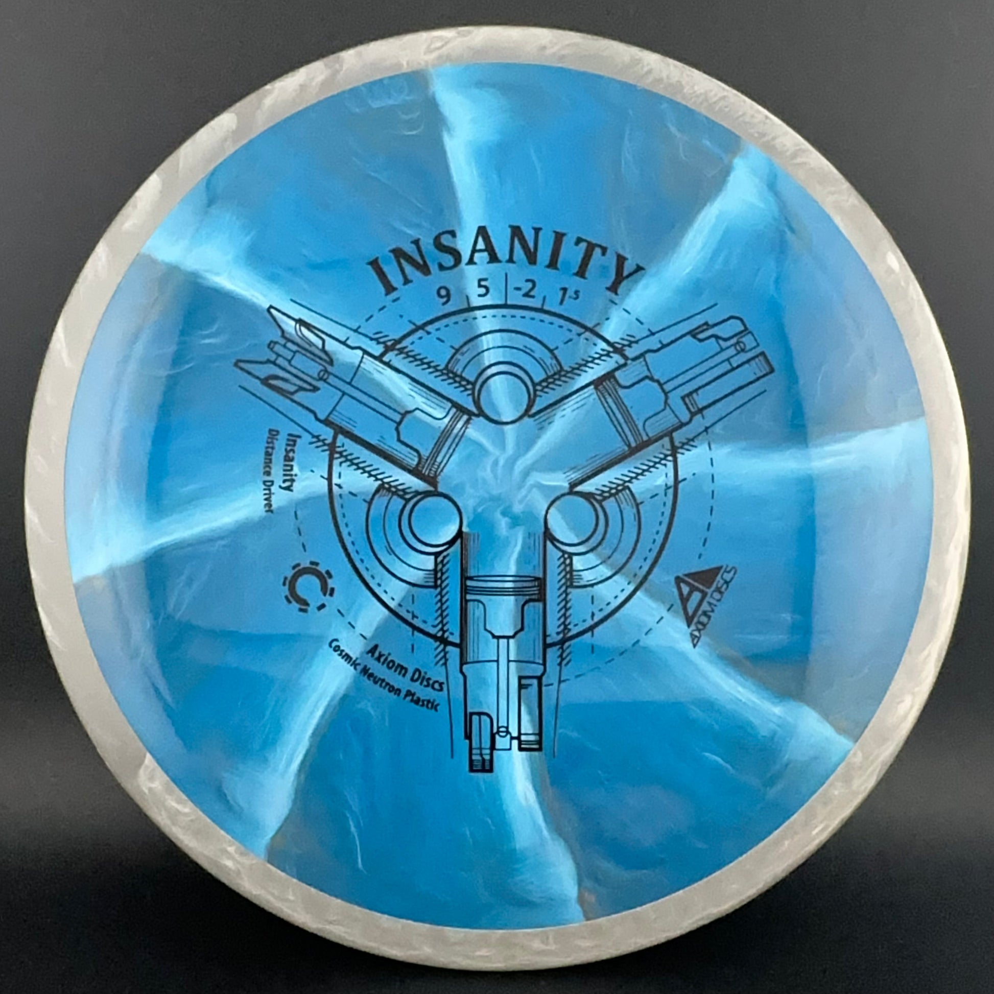 The Insanity was Axiom's first distance/control driver. This disc is slightly less stable than the ultra popular MVP Inertia. The Insanity flies like a longer crave, and will provide straight as an arrow flights for intermediate players, and slightly understable turnovers for power players.