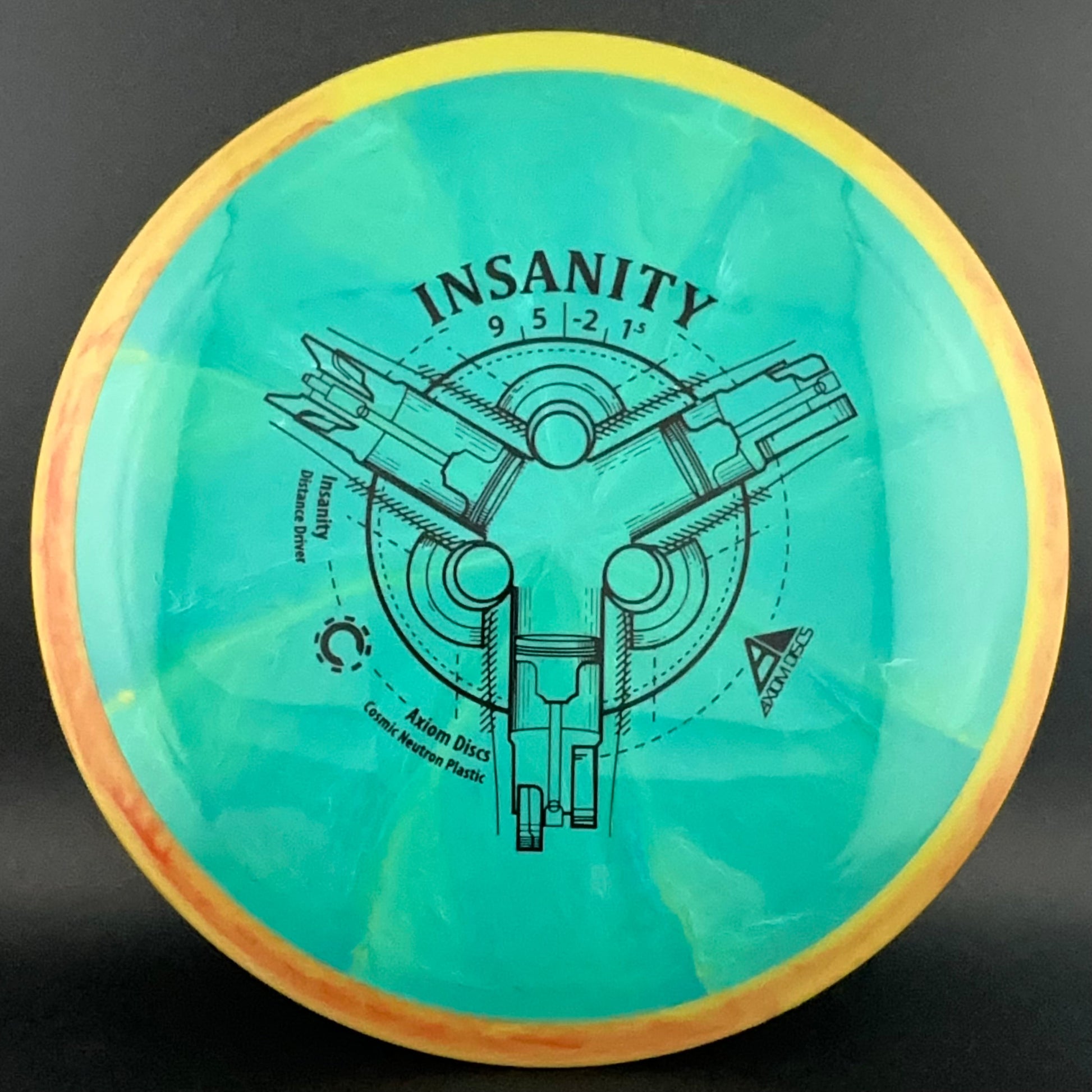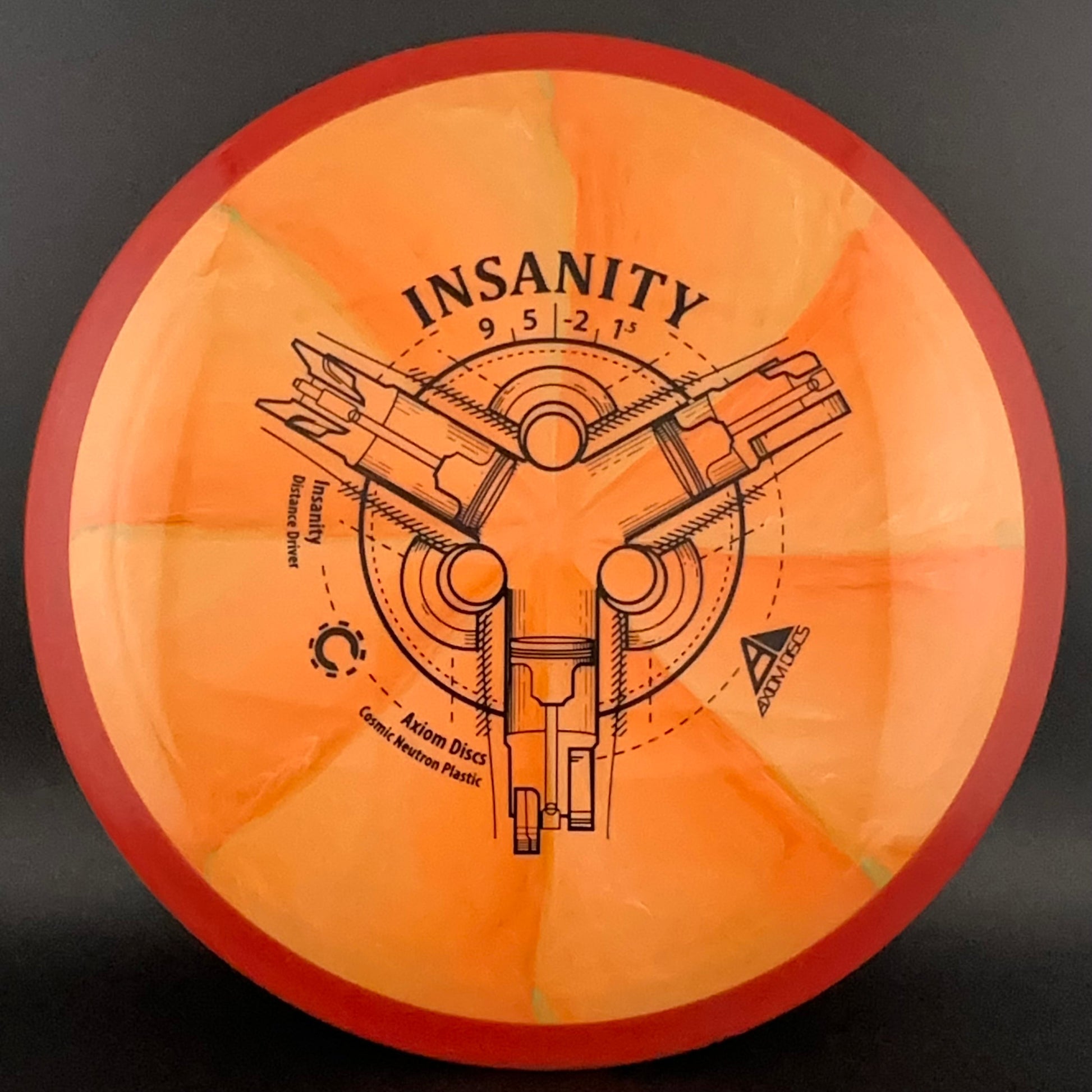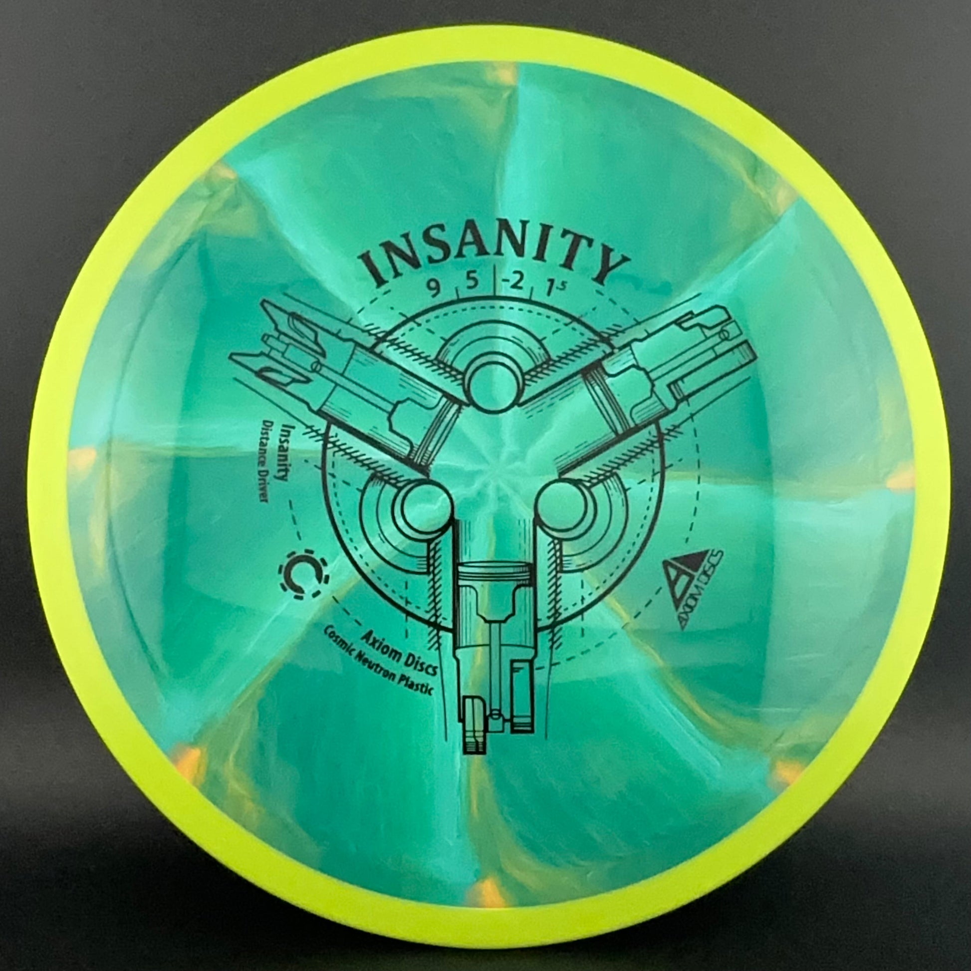The Insanity was Axiom's first distance/control driver. This disc is slightly less stable than the ultra popular MVP Inertia. The Insanity flies like a longer crave, and will provide straight as an arrow flights for intermediate players, and slightly understable turnovers for power players.
