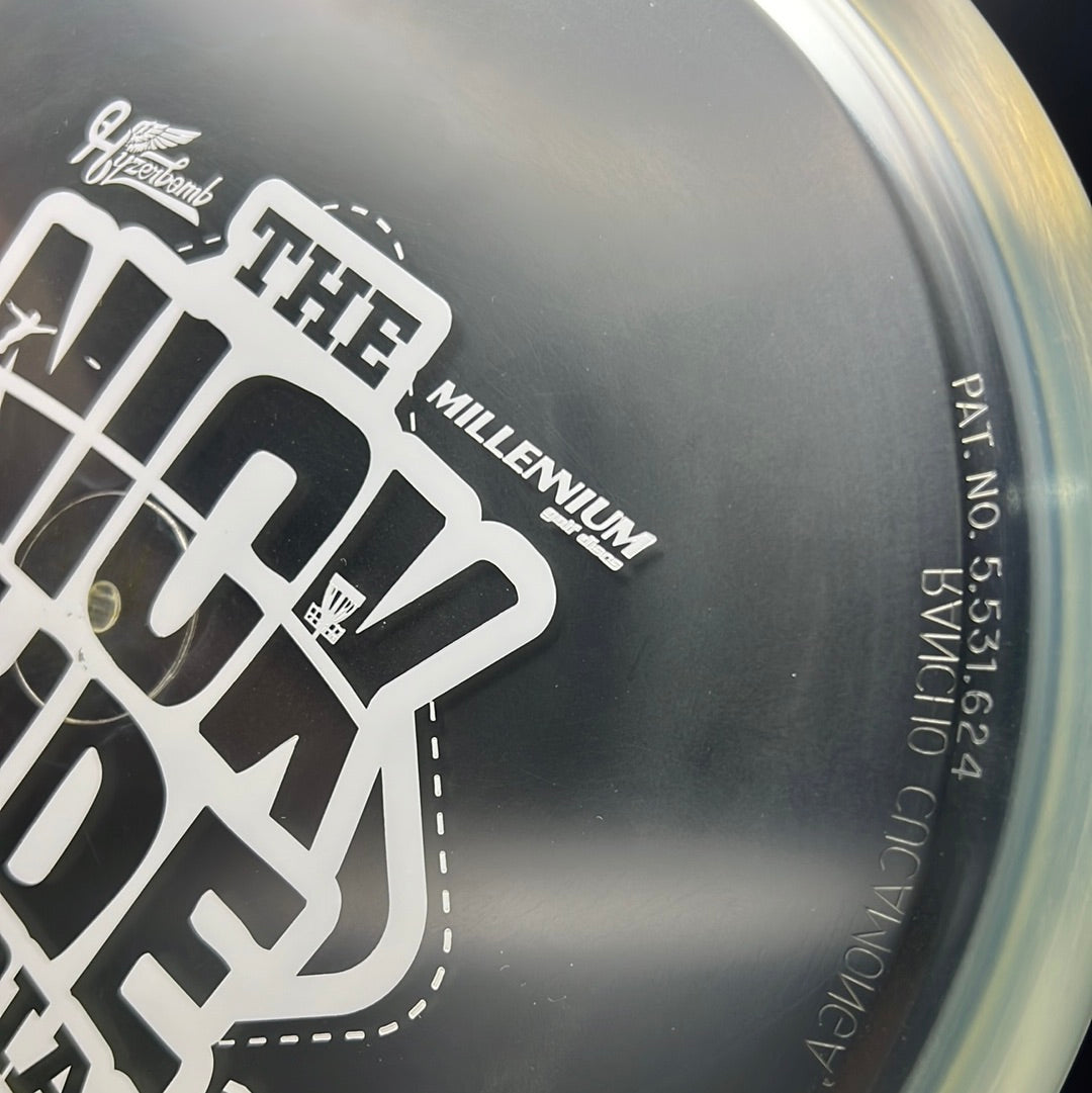 If you’re looking for a putter that flies like a Tank, reach for the Millennium/Hyzer Bomb Tank. This unique putt and approach disc has a broad flat profile and an extra wide thumb tack grip. The beefy rim of this disc gives it a solid feel that helps it stop like a tank. This is the ideal disc when you don’t want to overshoot, or skip past the basket. When thrown with power, the Tank is a fairly straight flying disc with minimal glide. It may exhibit a slight degree of high speed turn followed by a very minimal end of flight fade