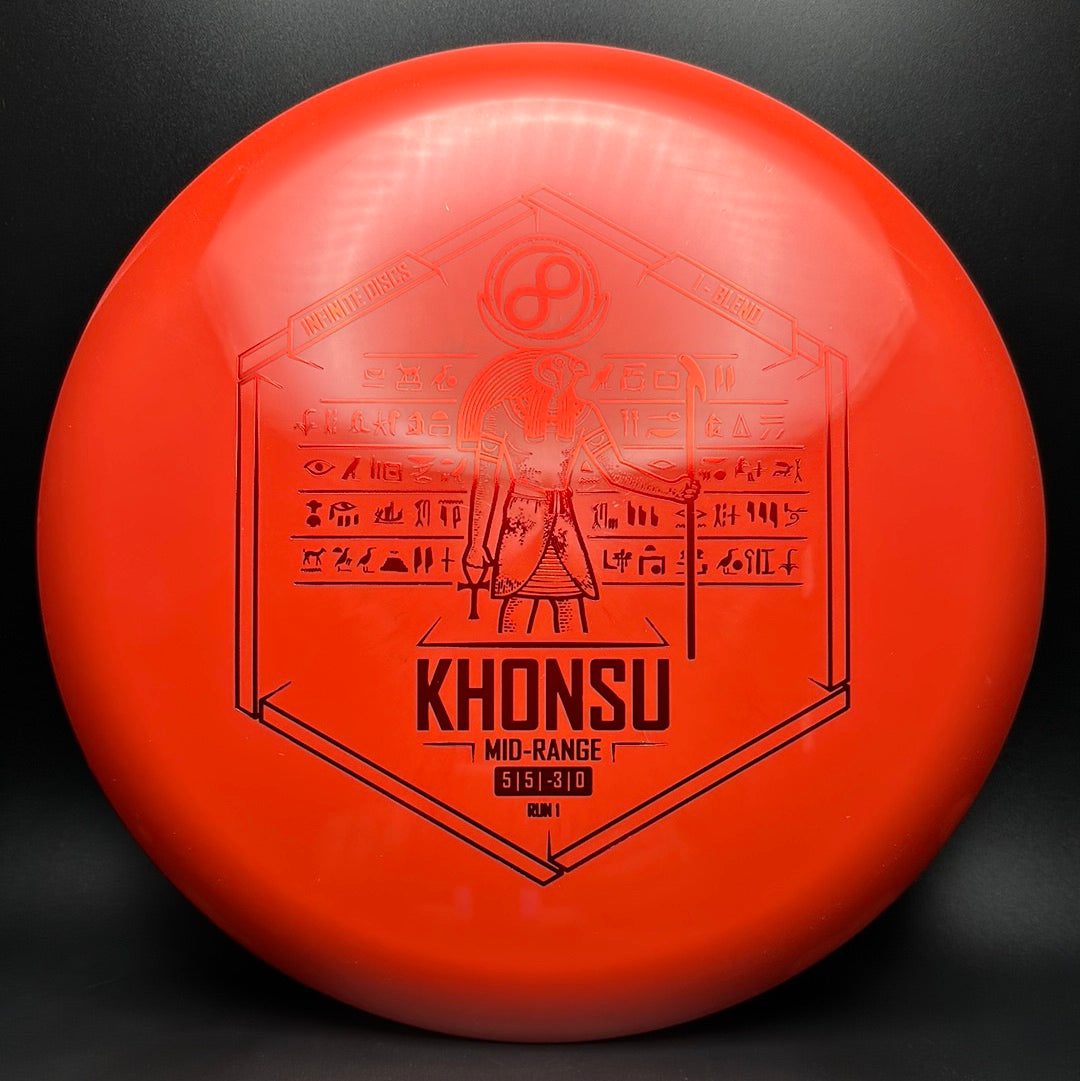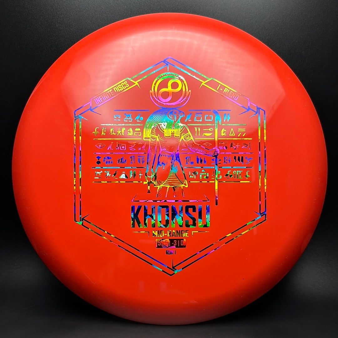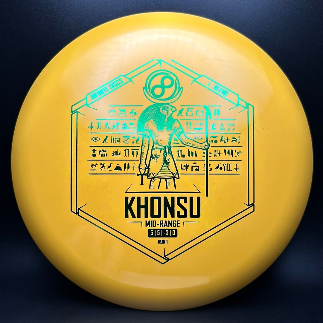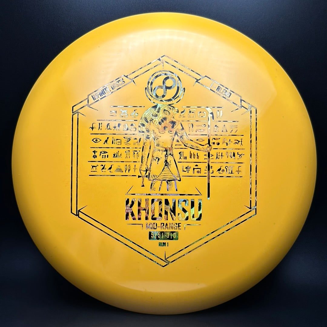 The Khonsu is an awesome, understable, beadless addition to Infinite's midrange line up. Throw the Khonsu on hyzer and it will go super straight, or give it a little anhyzer and it will hold the line when trying to get around something. This disc feels excellent and is a must for anyone needing an understable midrange.