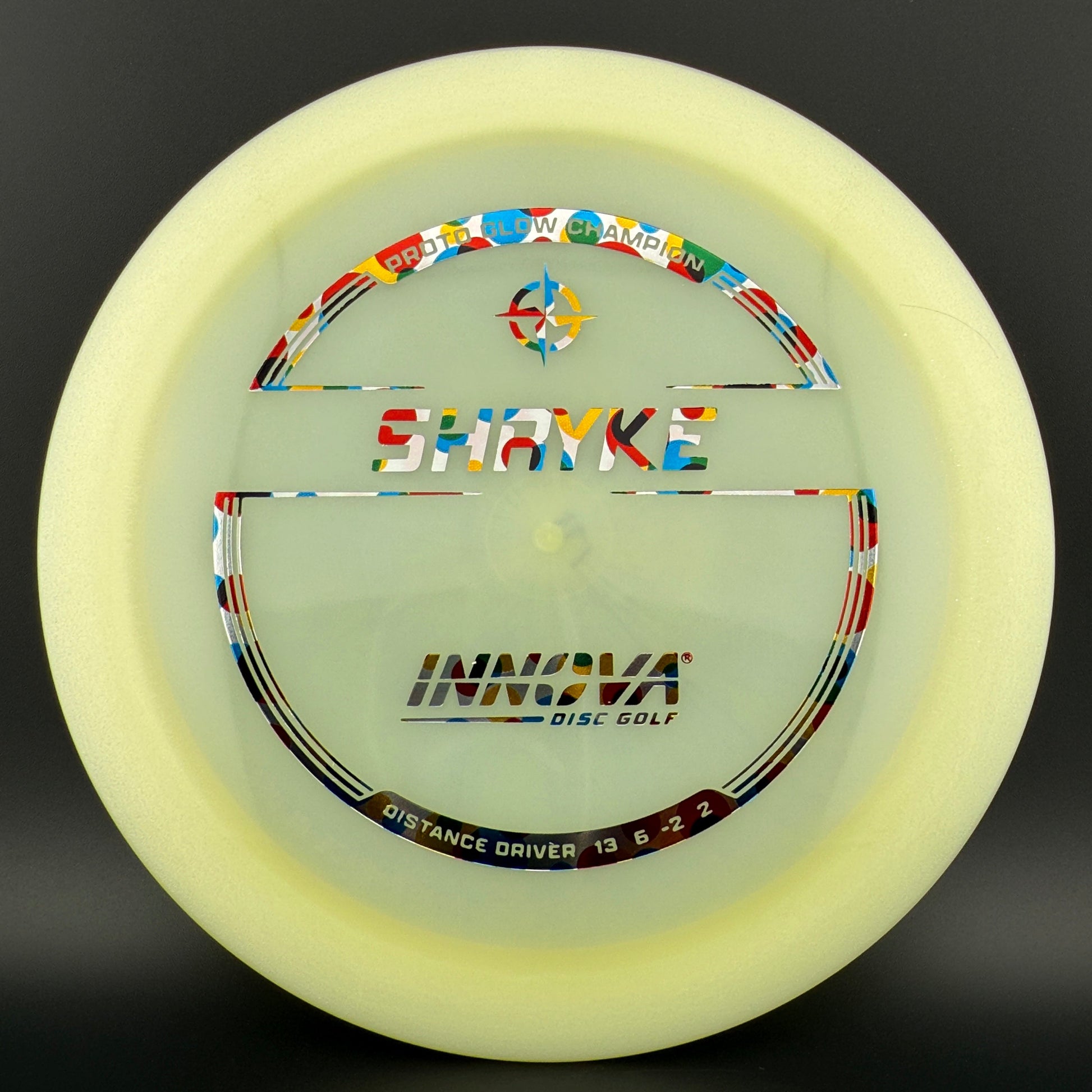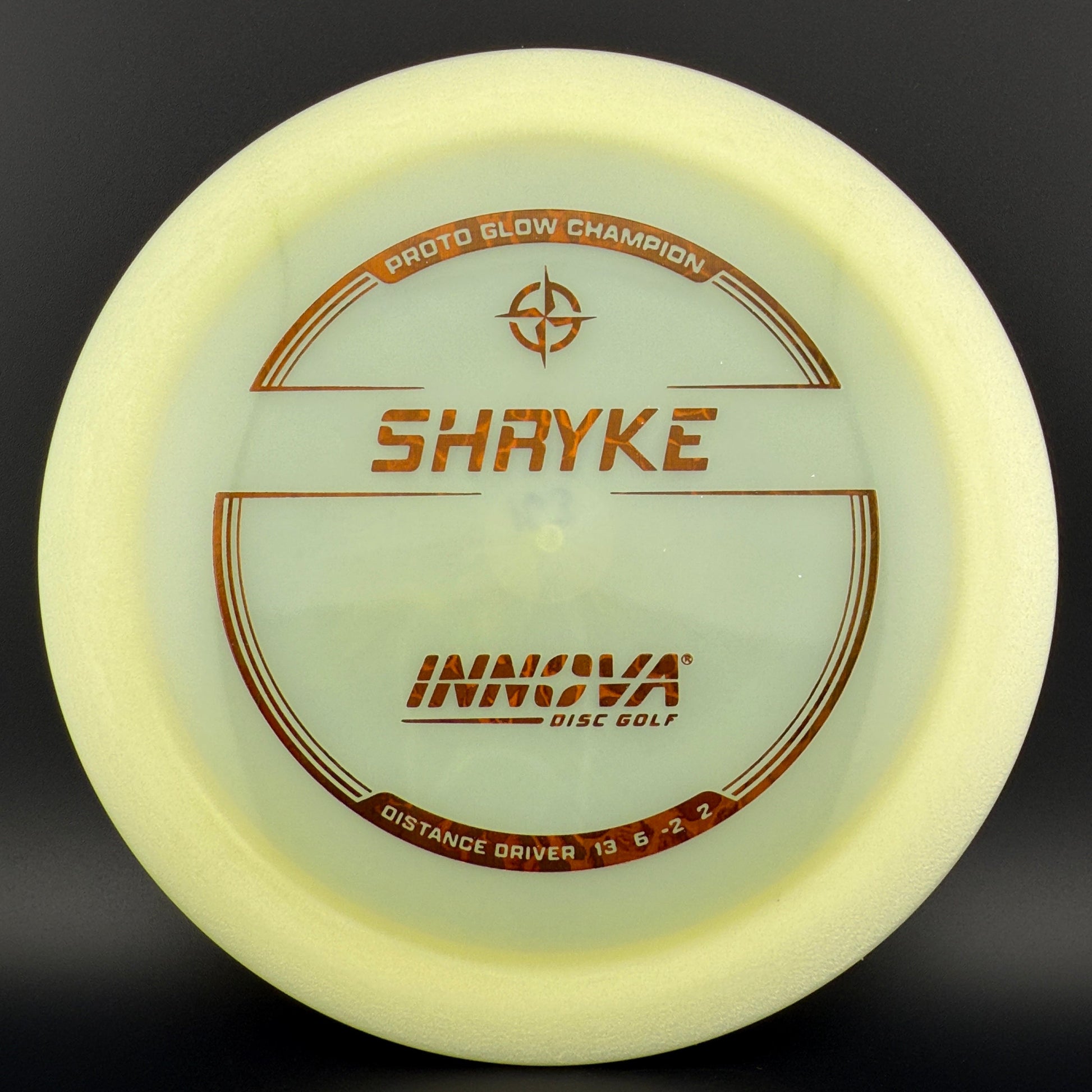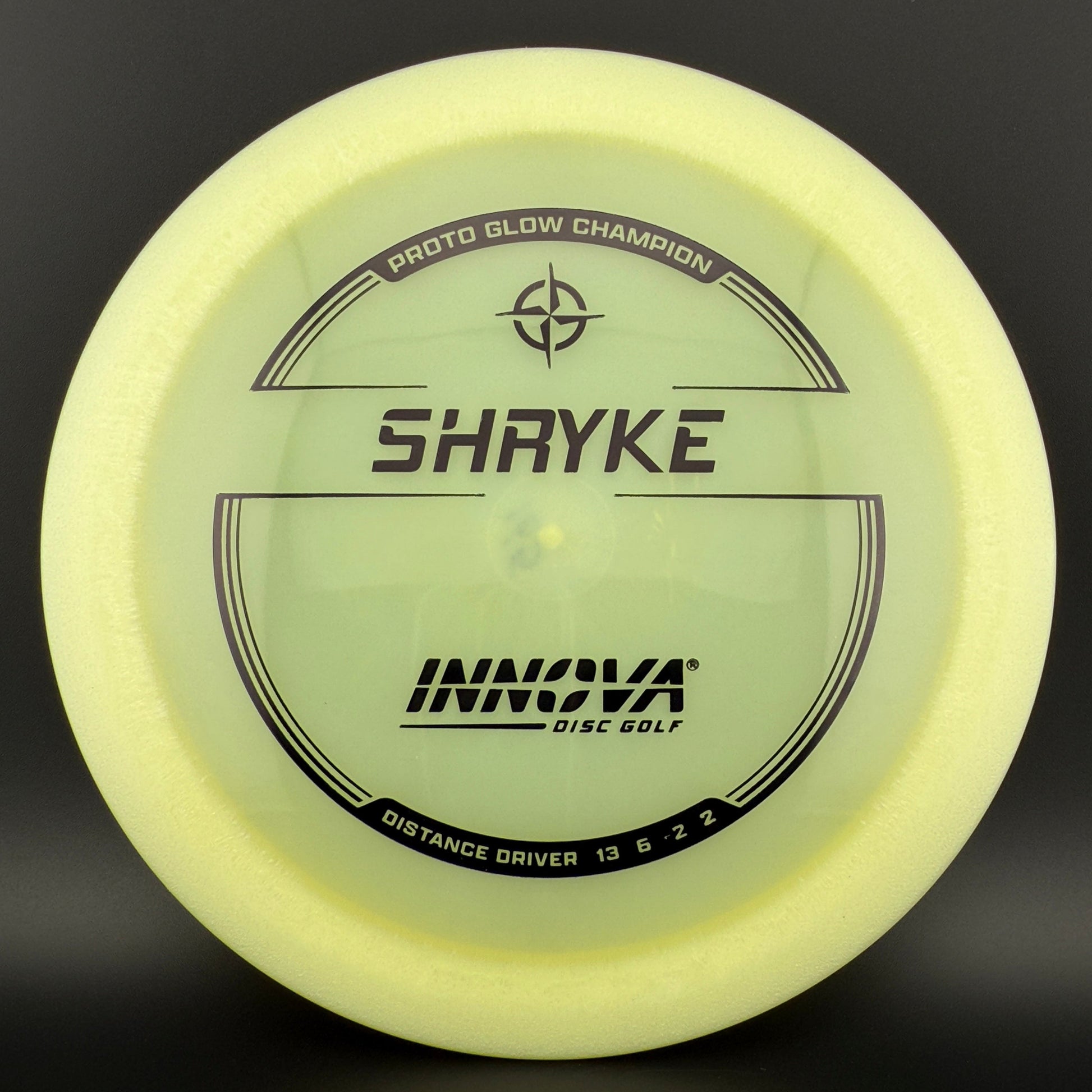 Proto Glow Champion plastic: Similar to Champion plastic in that it has smooth grip sufficient for mild, dry conditions. *Glow Champion plastic tends to be a tad softer than regular Champion discs. Champion plastic offers the least grip of Innova plastics. However, it rules the day (or night) in terms of durability.