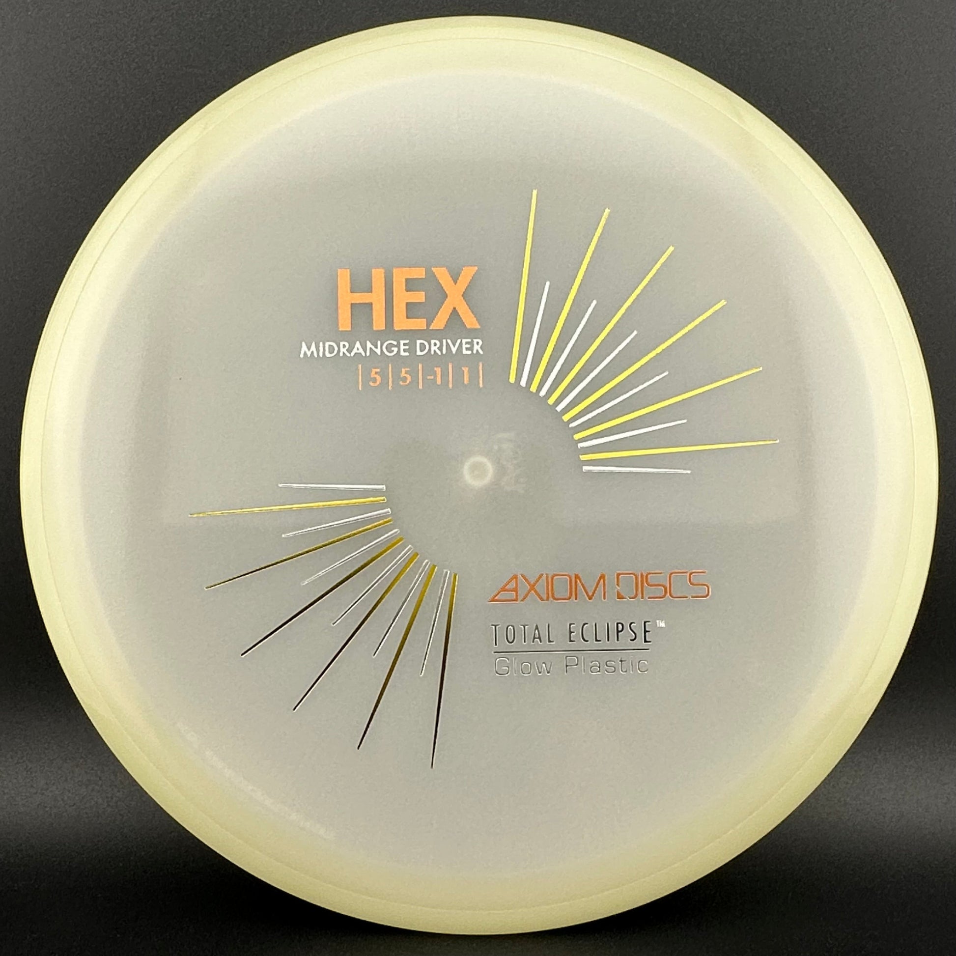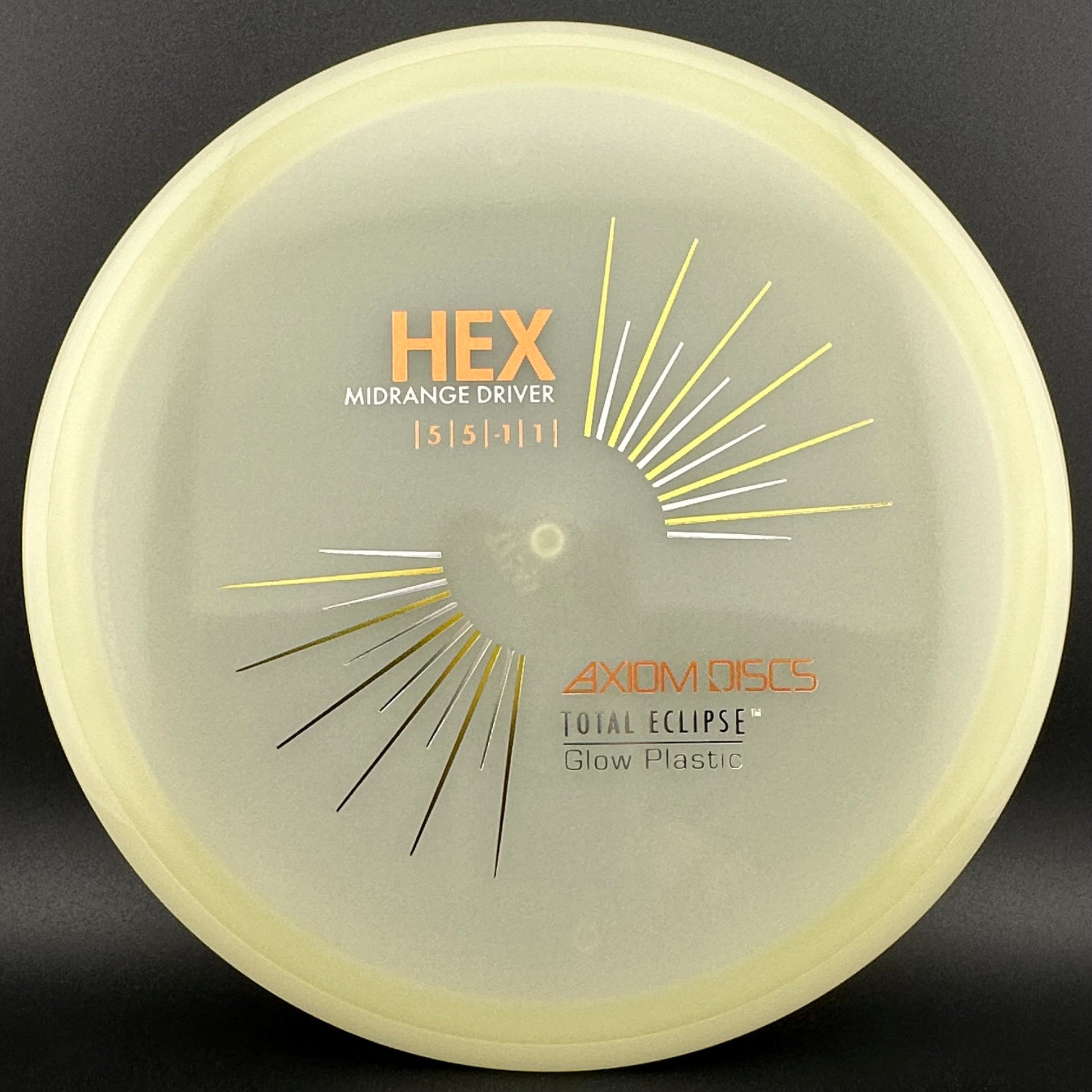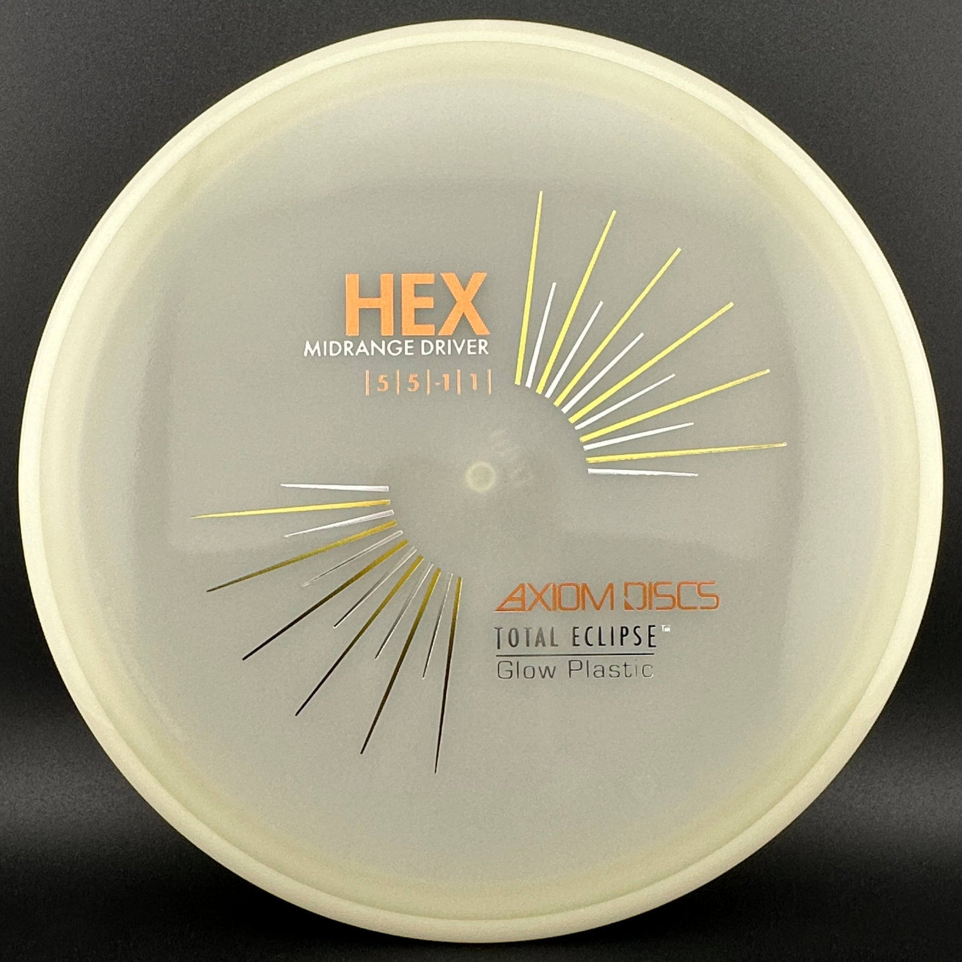 5/5/-1/1 *The first stock run of Total Eclipse Hex! Staff Favorite - check glow photos for different colored rims vs flight plates! White is slightly pink and white colored.